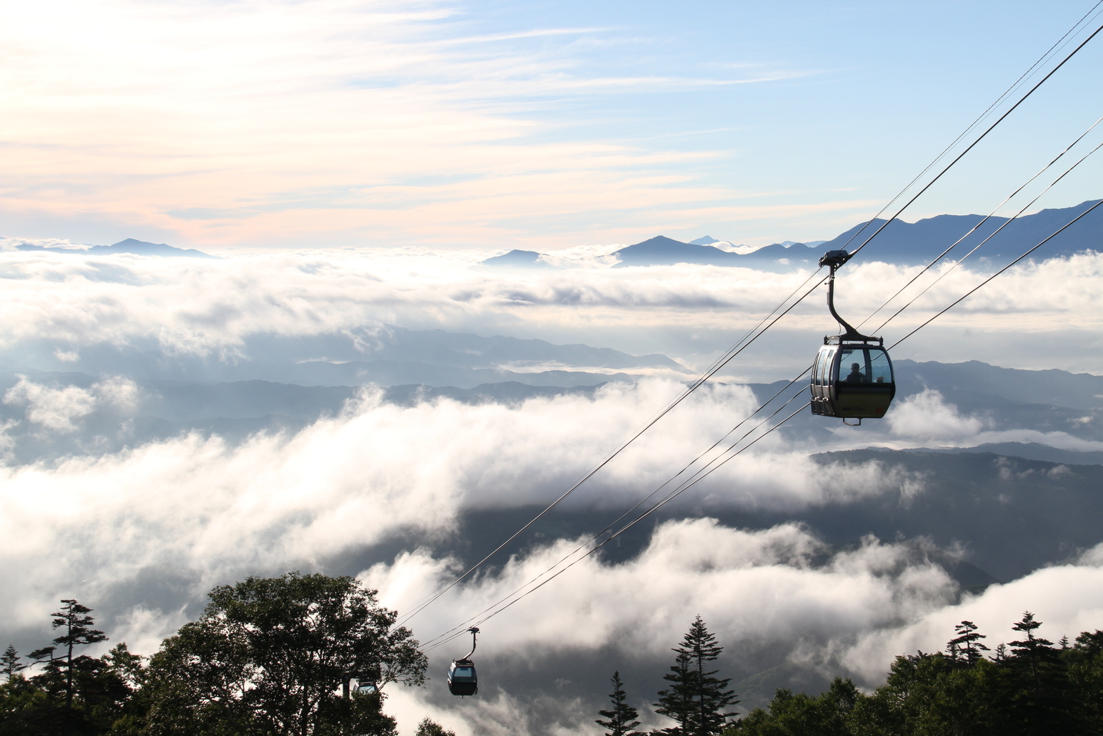 The Ontake Ropeway travels from a 1,570m point to a 2,150m point on the mountainside, overlooking the Kiso Valley and the Central Japanese Alps from above the clouds. At the top of the ropeway is a viewing platform with an illustrative guide to the surrounding mountains, a café, and a shrine surrounded by alpine flowers.