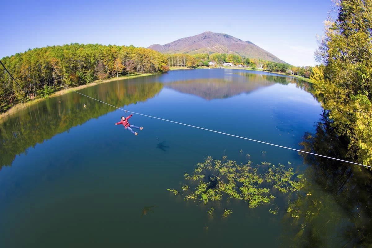 Experience the exhilarating thrill of flying through the air across the Iizuna Highland's Daizahoushi Pond.