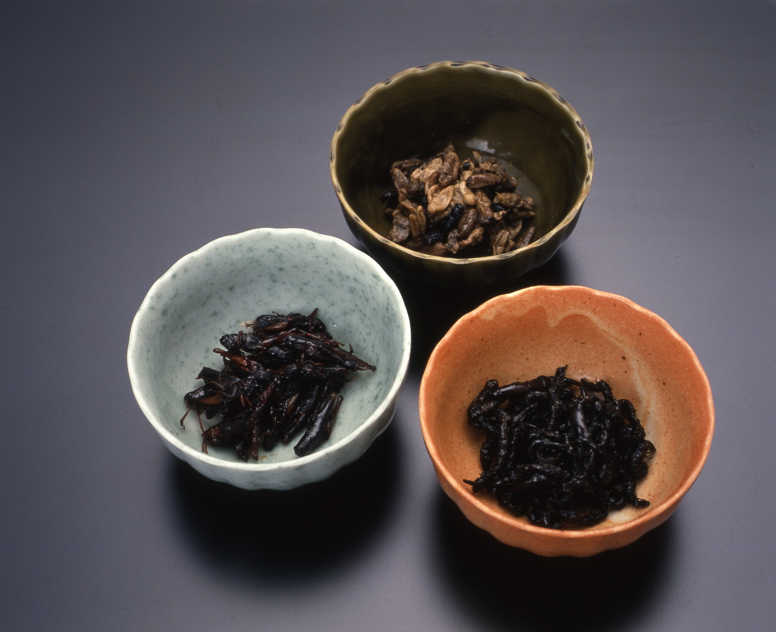 伊那谷には全国でも珍しい昆虫を食べる文化があります。なかでも「ざざむし・いなご・蜂の子」は3大珍味と言われています。今日のように栄養が豊かではなかった時代、昆虫食は貴重で大切なタンパク源でした。ざざむしは川の浅瀬に棲むカワゲラやトビゲラなどの幼虫の総称で、天竜川の「ざざざ」という流れの音からざざむしの名がついたと言われます。味付けは醤油で煮付けて食べます。12月から2月まで天竜川で四つ手網を使って行うざざむし漁は伊那市の冬の風物詩です。いなごは稲刈りの時期にとれ、砂糖や醤油、みりんなどで佃煮にして食べます。