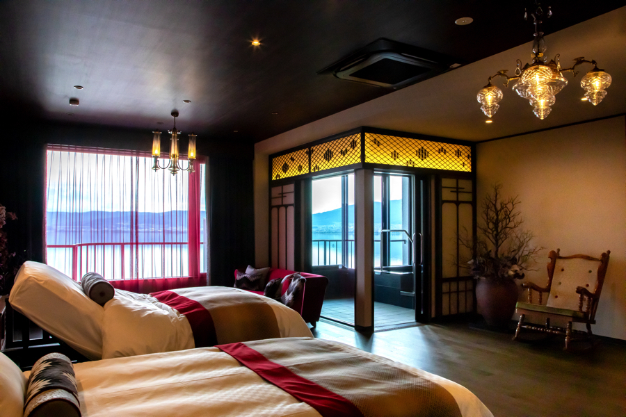 2022年8月、美湖の雫 露天風呂付き客室がリニューアルオープン。眼下に広がる諏訪湖を一望でき、海外から取り寄せたファブリックが和モダンで個性的な設えです。使いやすさにもこだわった段差がない等ユニバーサルデザイン仕様の室内は、多くの方が過ごしやすい空間。障がいなどの有無にかかわらず、どなたでもご予約いただけます。ベッドは最大4台まで設置でき、ご家族皆様4名様までベッド(内1台電動ベッド)にてお休みになれます。