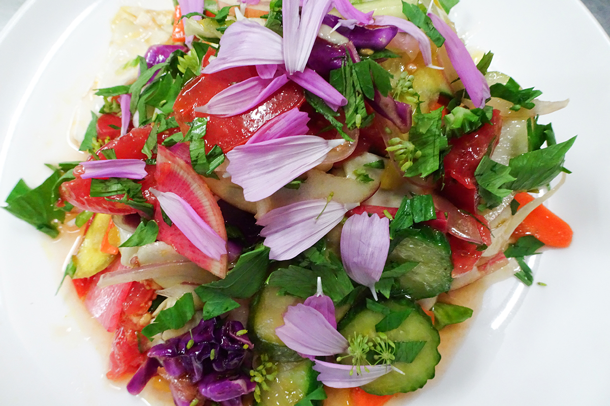 近年、店の地域内に、無農薬農産物の生産者が多くなり、ほとんどを地元産オーガニックの食材で料理しています。基本となる調味料の塩、味噌、醤油などは、特注で生産してもらったものを使用し、健康に配慮し、ビーガン、マクロビオティック料理も可能です。客人として国内外の有名シェフが多く訪ねきてくれるので、地元農林産物の生産者の紹介もしています。風土を皿に盛る料理を心掛けています。