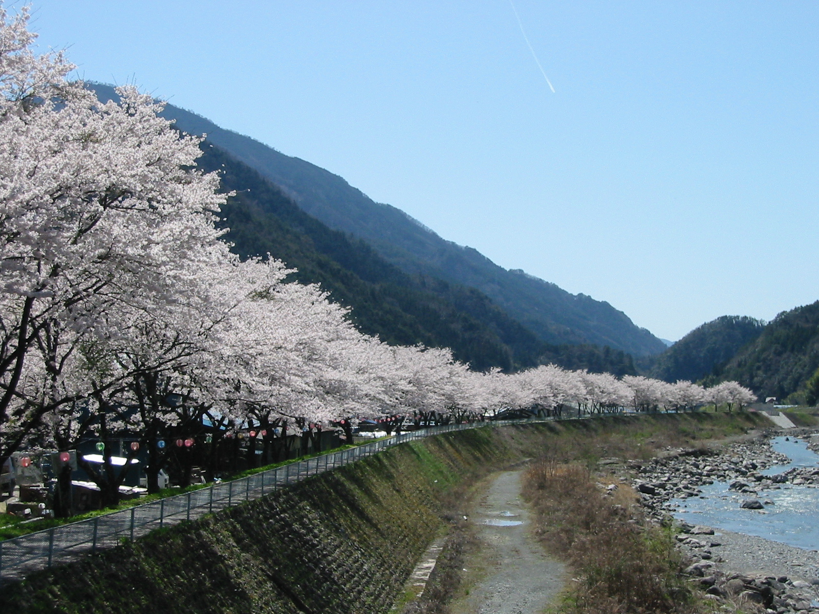 遠山川左岸の堤防にはソメイヨシノが約2.5kmにわたって60~70本の桜並木をなしています。