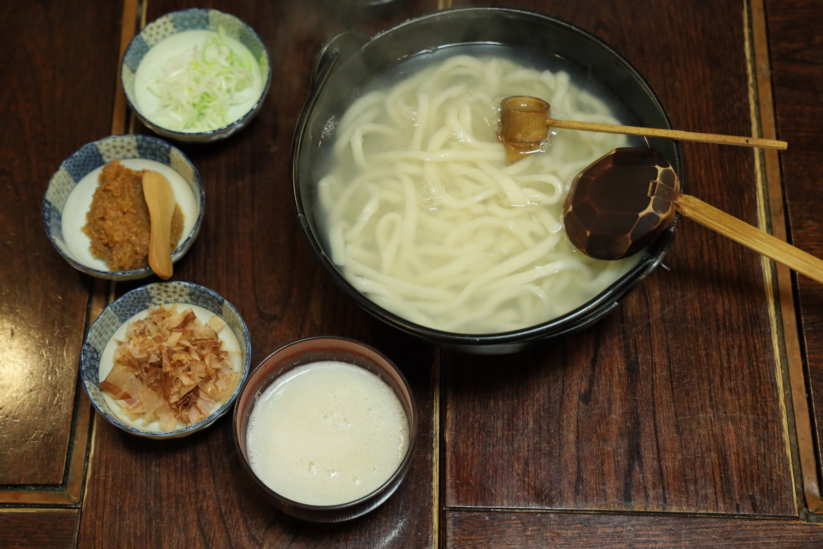 おろしたての大根にうどんを浸して食べるおしぼりうどん。味噌と鰹節、ゆで汁を加え 自分好みの味にして頂くスタイル。古波久のうどんは麺が少し固く太いのが特徴です。 そのほか、一品料理や信州の地酒を取り揃えています。店内は風情ある落ち着いた雰囲気で気兼ねない店長さんとのお話も楽しめます。