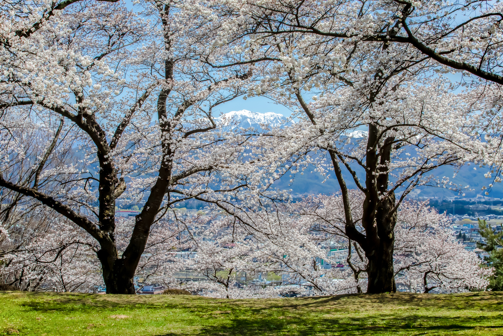 中央・南アルプスを背景に伊那市街を一望できます。公園内には約420本のソメイヨシノとコヒガンザクラが咲き、赤い橋から見る桜は一見の価値あり。満開の桜の下、遠く白雪に輝く南アルプスは格別の眺めです。