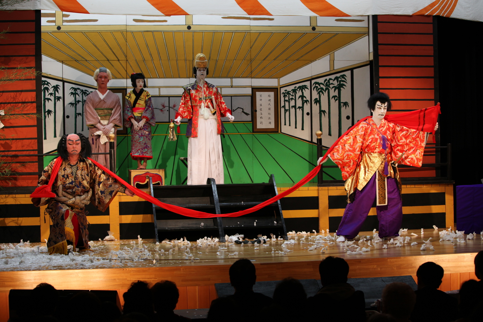 長谷中尾地区に伝わる中尾歌舞伎は、江戸時代中期、地元の小松浅右衛門が四国の旅芸人から義太夫を伝授されたのが始まりとされていますが、第2次世界大戦中から戦後にかけて途絶えてしまいました。「慶応元年丑歳」と記された引き幕が現存しますが、その時代を唯一今に伝えています。