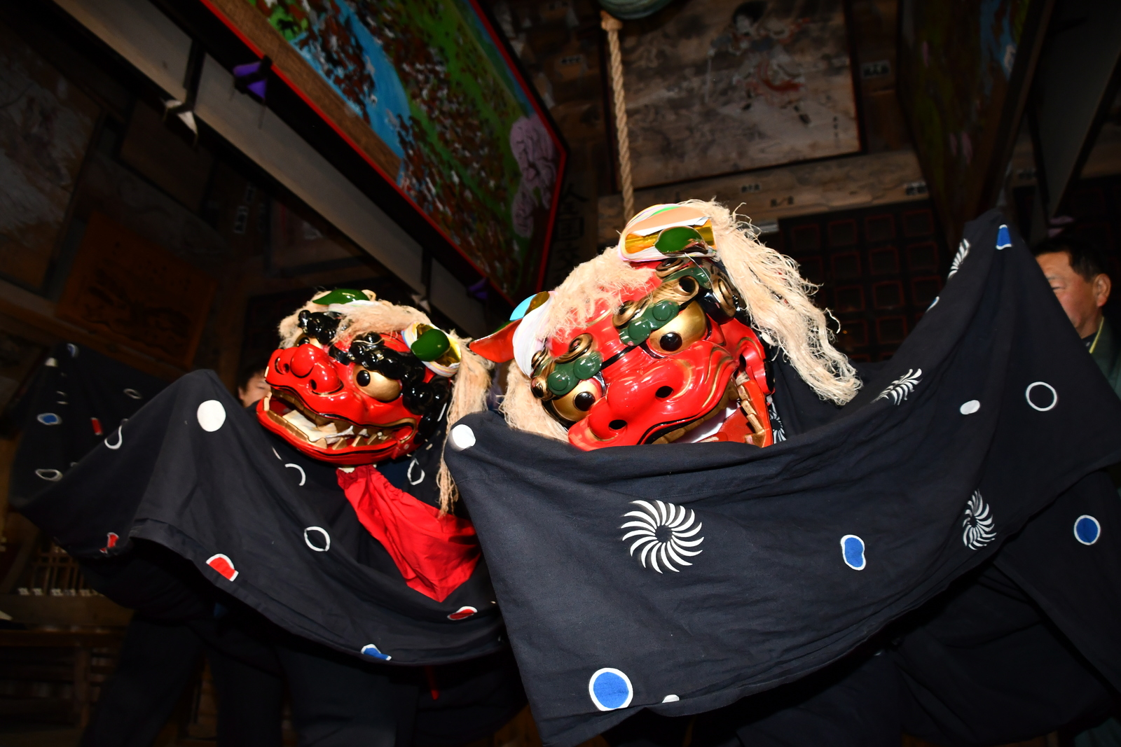 伊那市羽広地区に古くから伝わる小正月の伝統行事で約400年の歴史をもつ獅子舞。毎年1月15日に一番近い日曜日に行われています。雄獅子(口を閉じている)と雌獅子(口を開いている)の二頭で「舞い合わせ」るのが最大の特色。雄・雌の獅子が一緒に舞う獅子舞は全国でも珍しく、雄は勇壮活発に、雌はやさしく静粛に舞うとされています。