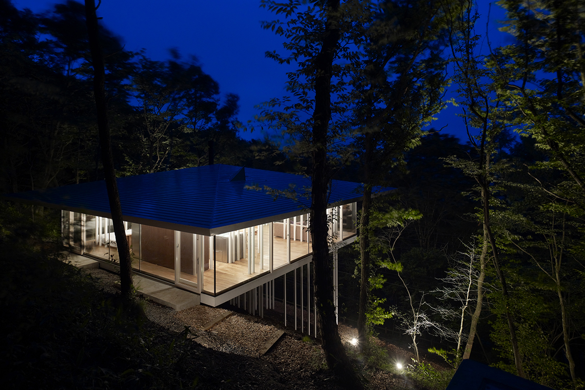 建築家の武井誠さんと鍋島千恵さんが設計し、国内外のメディアに紹介された週末住宅が一棟貸しの別荘に。周囲の木立と同化する76本の細い柱が屋根と床を支える構造で、ガラスの箱が傾斜地に浮かぶような姿が印象的。室内には間仕切り壁がなく、家のどこにいても森の眺望を楽しめます。