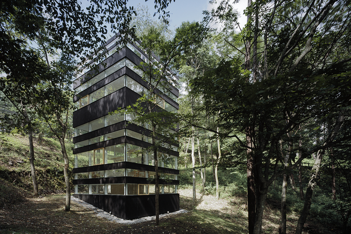 軽井沢の木立を楽しむために、さまざまなレベルと方向に眺望を開くようデザインされたストライプ状の外観が個性を放つ別荘。設計は武井 誠さんと鍋島千恵さん。地下1階+地上2階の3層構造で、天井高4mの開放的なLDKや木々が間近に迫るバスルームなどどの空間も森に囲まれ、緑に埋もれるような感覚です。