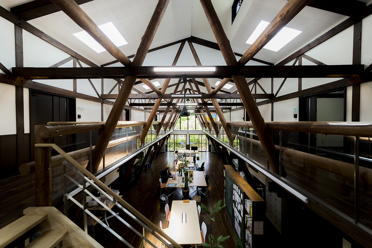 富士見町にある、個室型オフィス 、コワーキングスペース、会議室、食堂を備えた複合施設。4つの部屋と共有リビング、ウッドデッキを備えた宿泊棟を併設し、 仕事だけでなく宿泊もできます。