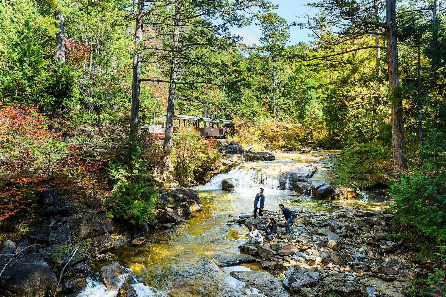 涼しい風が吹き抜ける鉄道にゆられながら、紅葉の森をめぐるひとときを