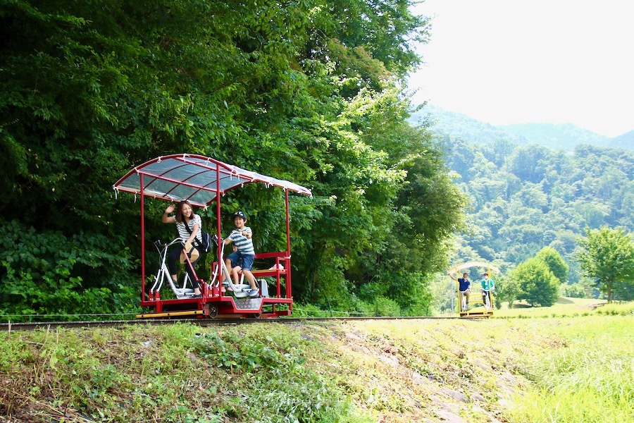 かつて林業で、木材の運搬用に活躍していた王滝森林鉄道。松原スポーツ公園で設置されてきたレールの上を、「林鉄バイク」(自転車を改造した乗り物)で、昔に思いを馳せながら、レトロな気分で周遊!