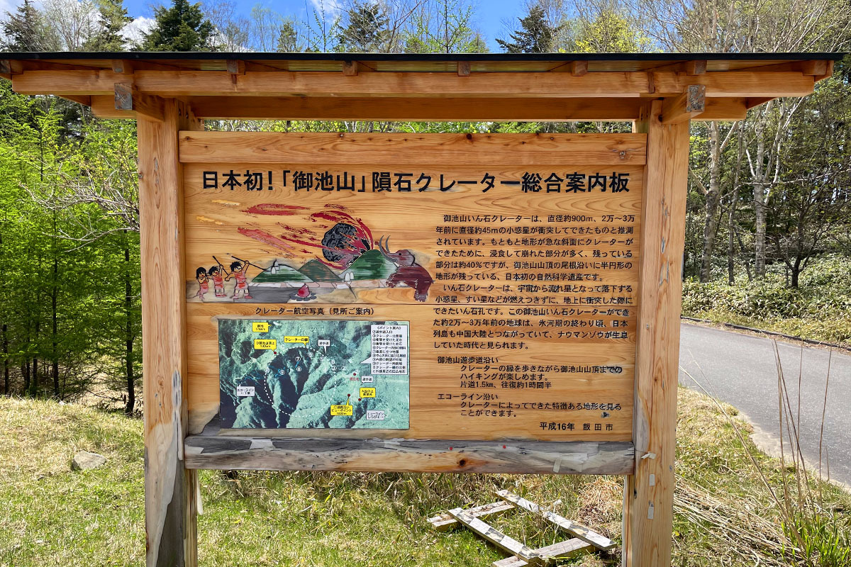 御池山隕石クレーターは直径約900mで、直径約45mの小惑星(隕石のかたまり)がおよそ2~3万年前に御池山南東斜面に衝突したと推測されます。現在、御池山の尾根沿いを中心にクレーター地形の約40%が残っています。