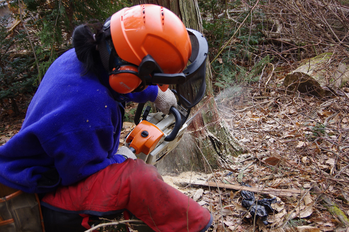 この日が初回の作業。あまり広いスペースがないので、木の伐倒は位置を選びながら慎重に行います。この日のメンバーのうち、唯一の女性である唐澤千夏さんに付いて、まずは作業を見学させてもらいました。