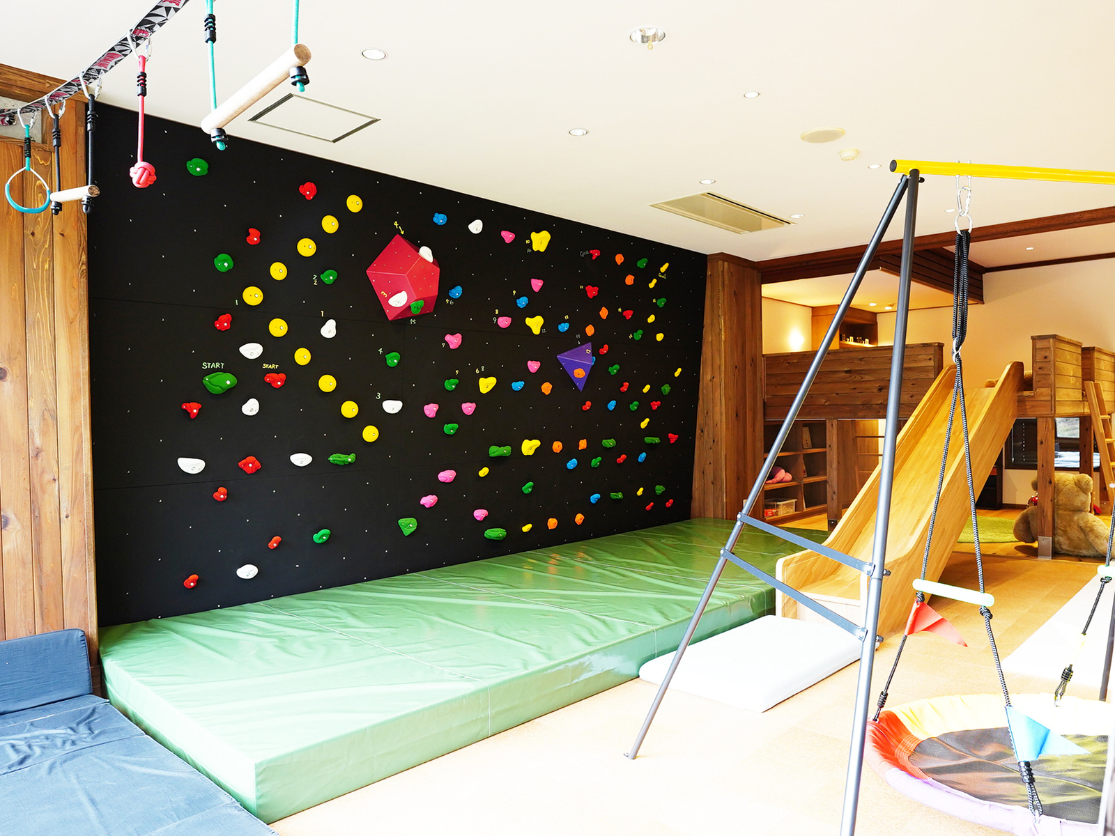 壁一面にはロッククライミング、スラックラインのロープを使ったぶら下がり遊具など、遊び心があるオリジナルの遊具も用意しています。