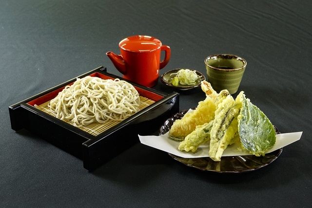 こだわりの手打ちそばと、季節の野菜やゆり根の天ぷらがセットになった、定番のメニューです。