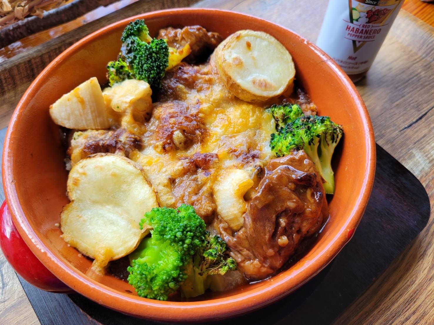 野沢菜炒めをご飯に混ぜ込んだ野沢菜ライスの上に、コクのあるビーフシチューと、とろけるチーズがたまらない!注文を受けてから焼き上げる熱々の1品。今シーズンスタッフ一押しメニューです!