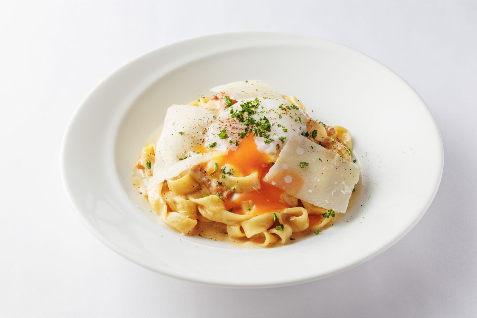 スタッフのまかないから生まれた、癖になる味噌カルボナーラと相性の良い平打ち生パスタ。温泉たまごをトッピングし濃厚な味わいに。