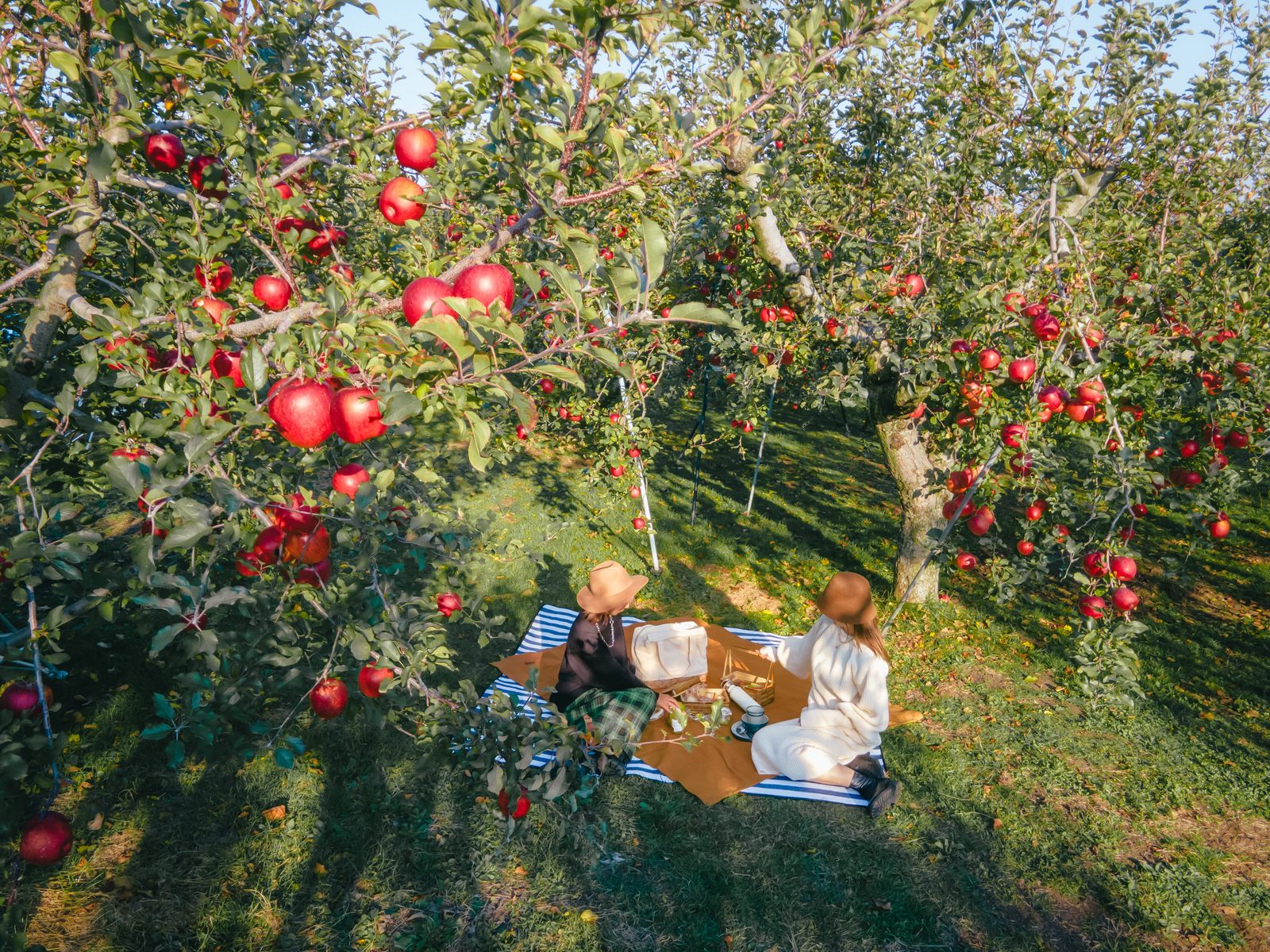 「くだものの里」長野県松川町。遠くにアルプスが見える果樹園の中で楽しむピクニック。バスケットをもち、レジャーシートを敷いて、 のんびりと楽しむ素敵な時間。