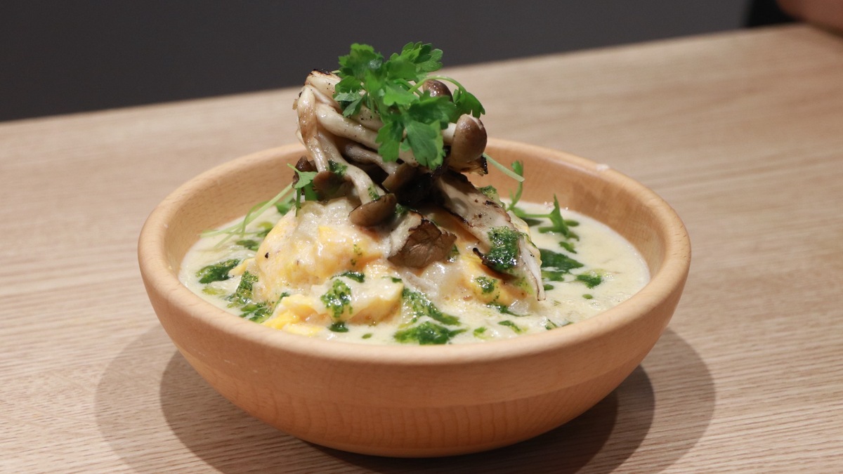 看板メニュー「シェフのオムライス」は、濃厚なクリームソースとバジルソースのダブル仕立てに、香ばしく炒めた長野県産きのこを贅沢にのせた一皿。唯一無二のコクと香りで、リピーターが後を絶たない人気メニューです。