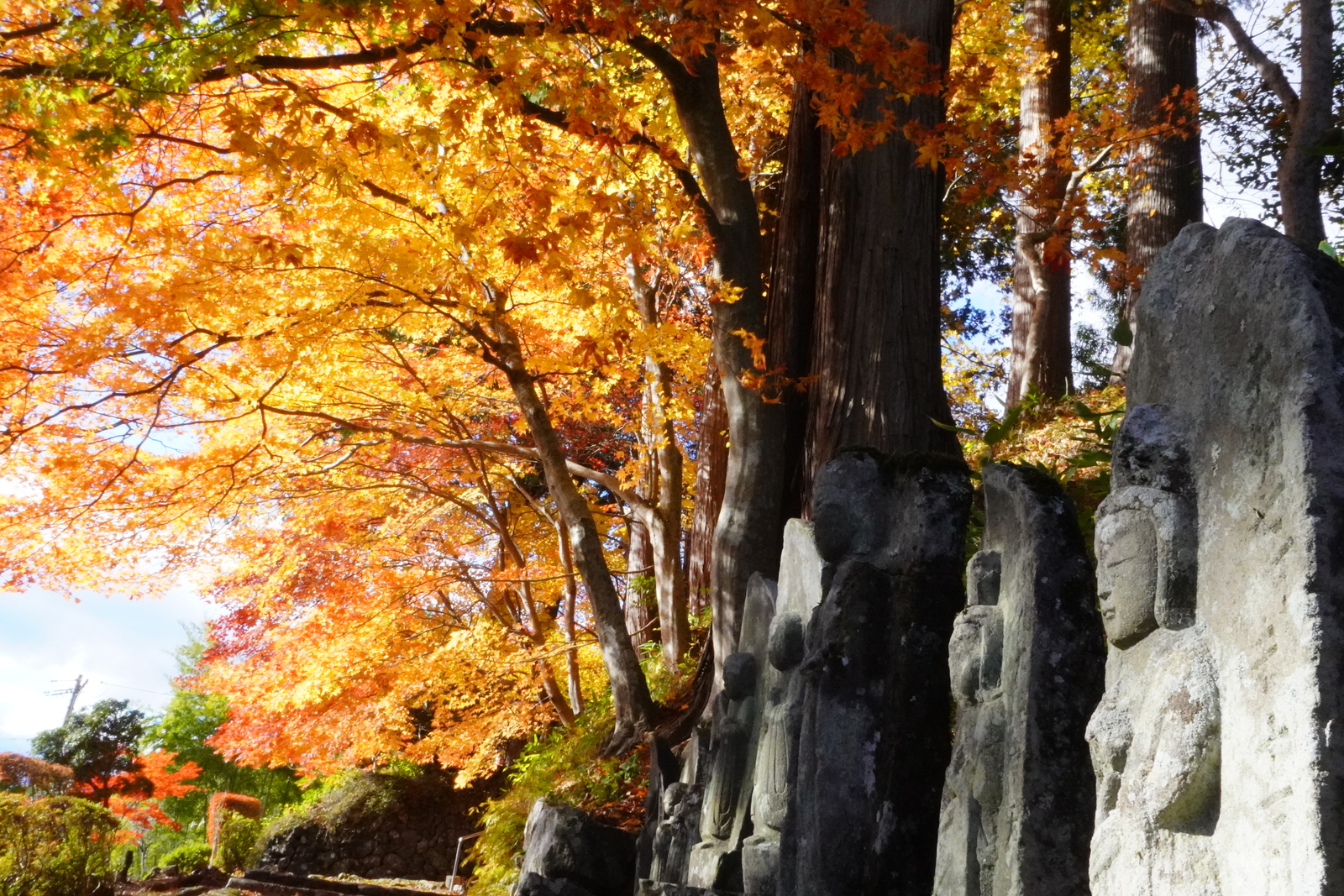 また秋には見事な紅葉がみられ、石仏と紅葉が美しい風景となります。