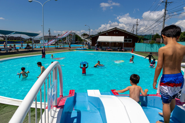 スライダーが付いた流水プールに、競泳プール、子供プールを備えています。水泳を楽しむ大勢の人で賑わいます。