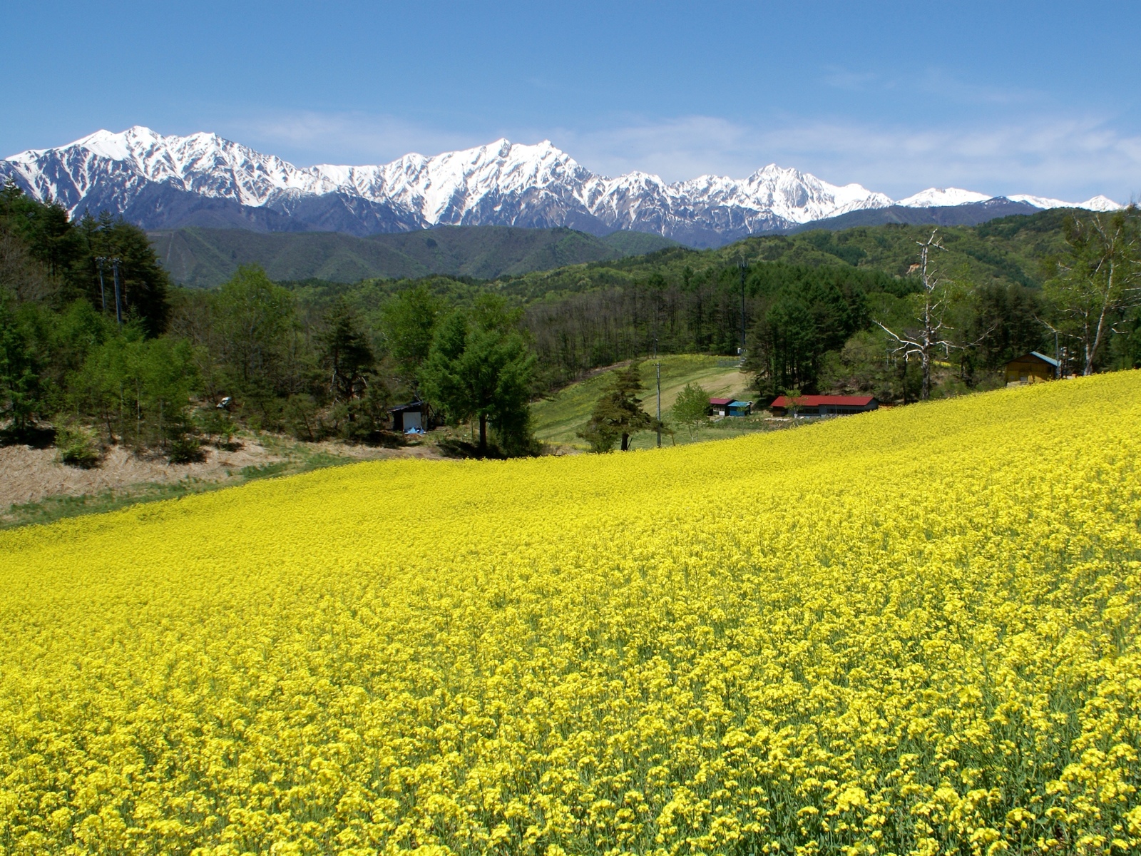 春には一面菜の花が咲き、秋には一面そばの花が咲きます。天気の良い日には、北アルプスをバックに花畑を楽しめます。