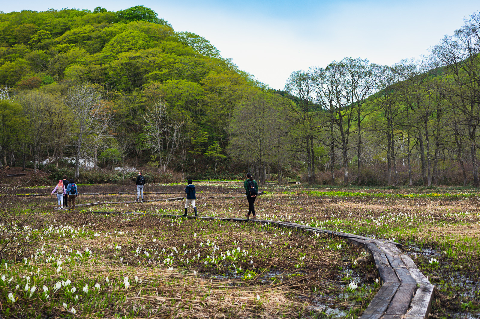 沼の原湿原では雪どけとともに、ミズバショウの見事な群生を見ることができる。