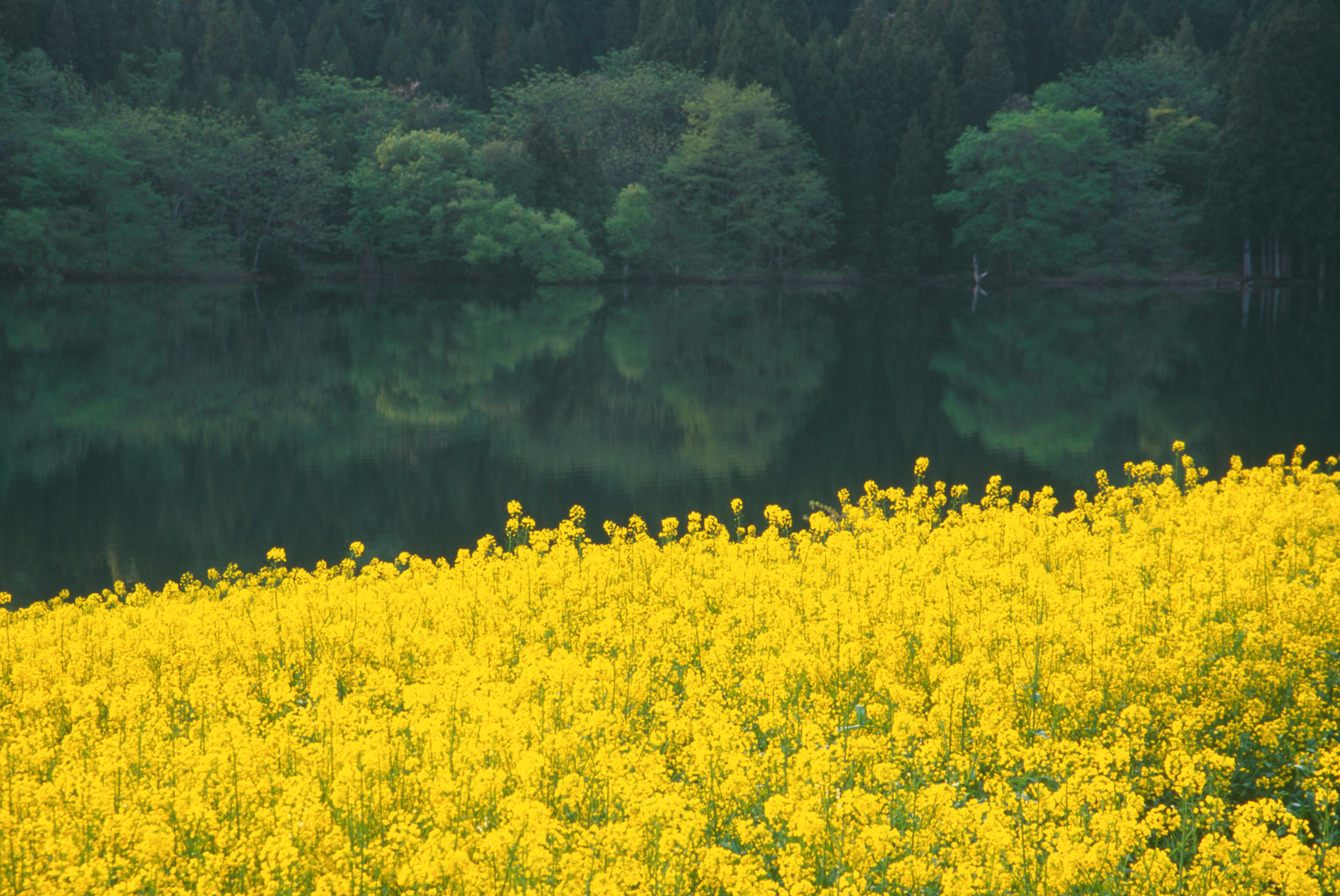 北竜湖畔に広がる菜の花畑。湖の青、山の緑とのコントラストが見事です。