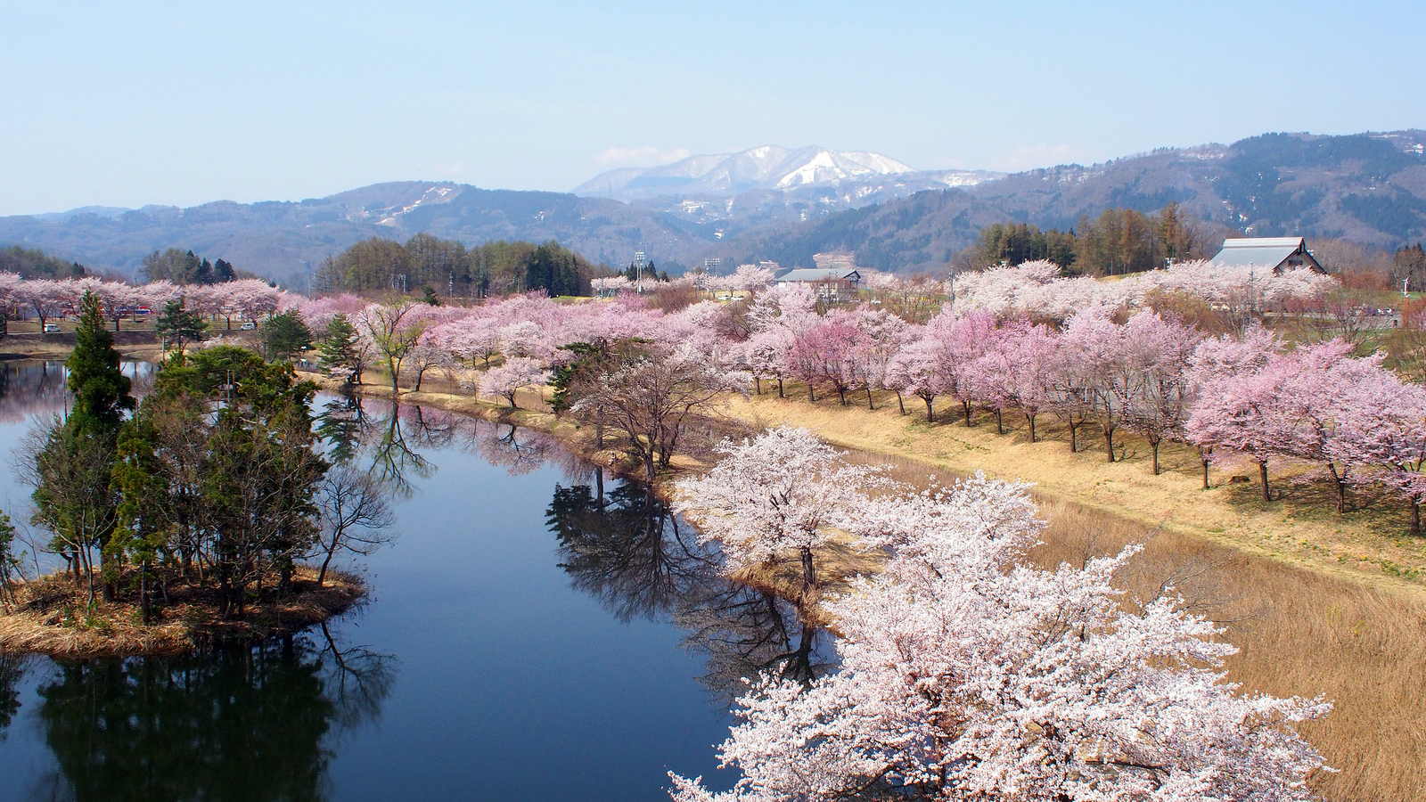 公園内にある「針湖池」や芝生を囲むように約550本のオオヤマザクラやソメイヨシノが並びます。例年の見頃は4月下旬~5月上旬。(異なる種類によっては5月中旬まで見ることができる)