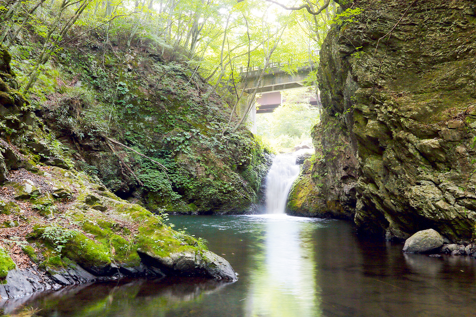 奥三川渓谷の入口道路のすぐ下を一筋に流れ落ちる滝で、広い滝壷が水をたたえています。