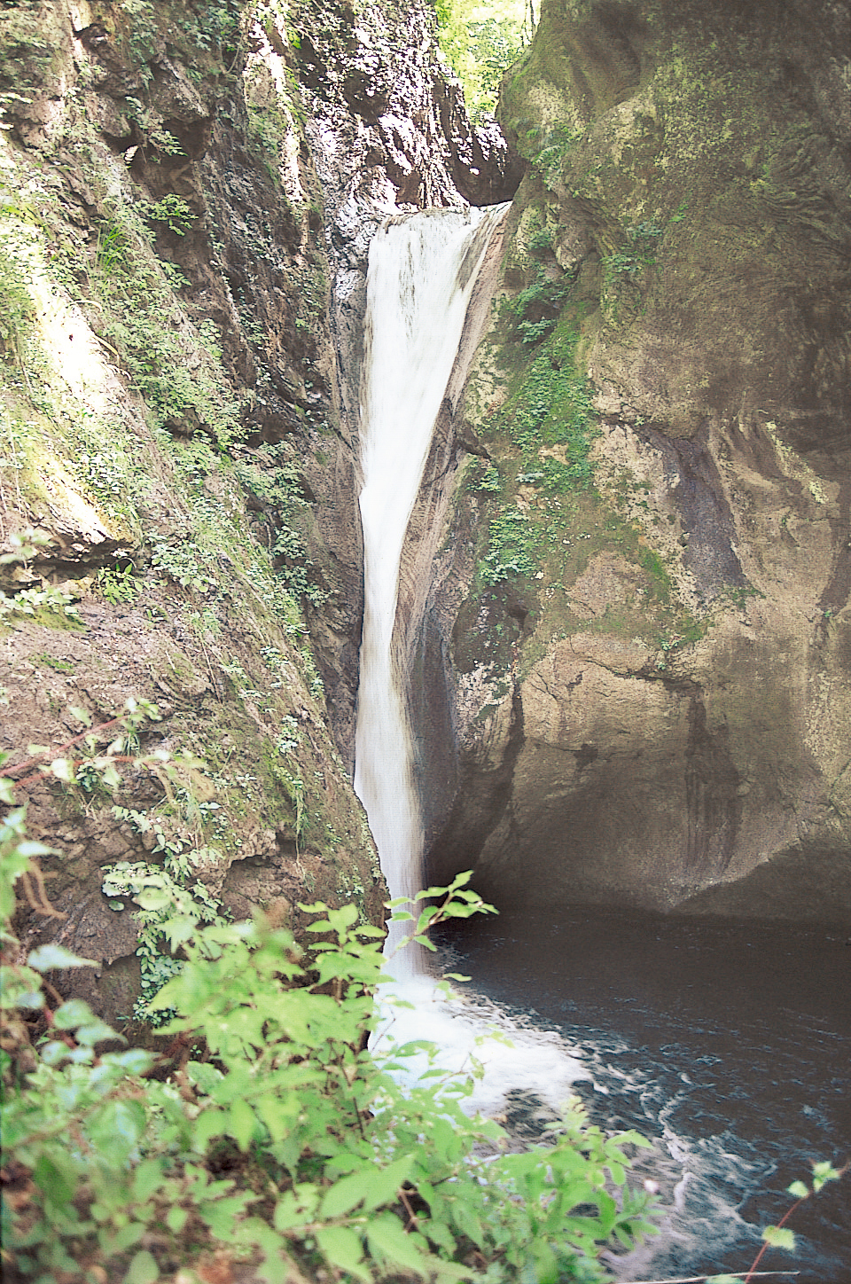 県の名勝に指定されている滝で甕状をした3つの滝壷からなっています。