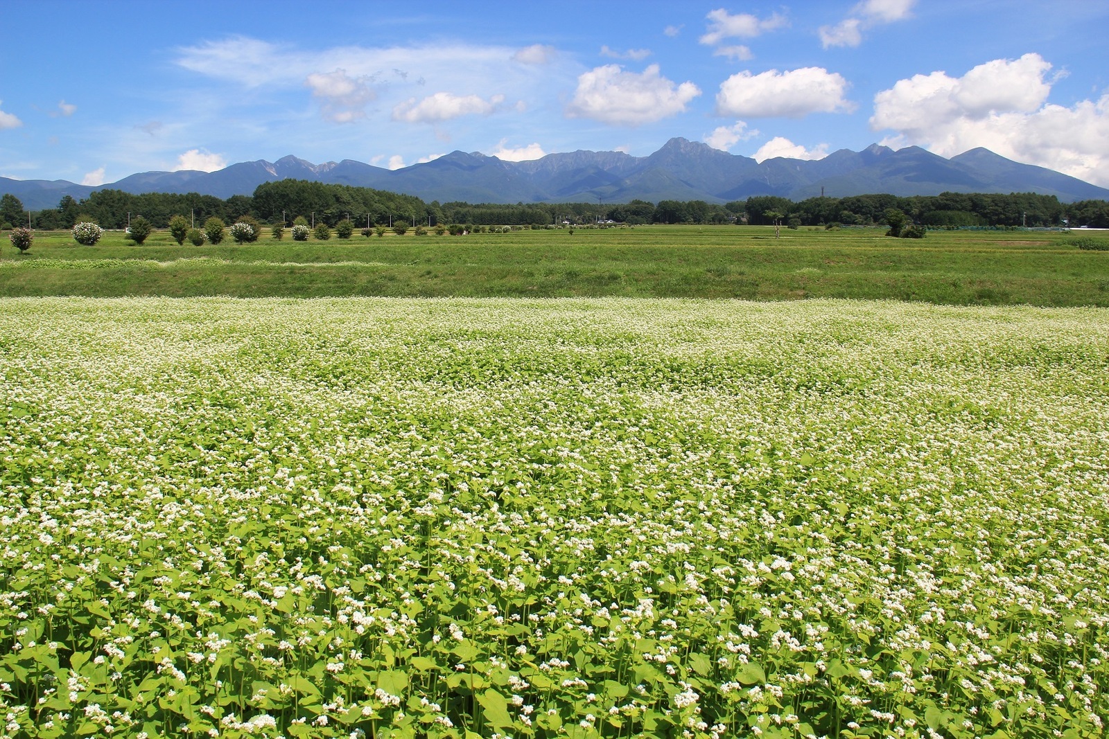 諏訪南インターから八ヶ岳中央高原に向かって車を走らせると皆さんを出迎えるそば。そば畑は村内のあちこちにあり、八ヶ岳を背景に白い花を見ることができます。