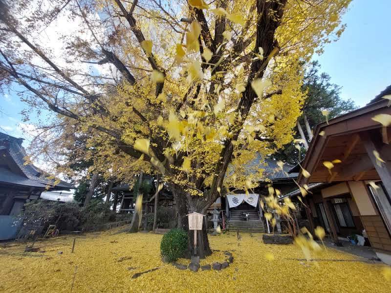 境内にそびえる樹齢400年を超える大イチョウの葉が黄色に染まる様は見事。落葉も境内を彩ります。