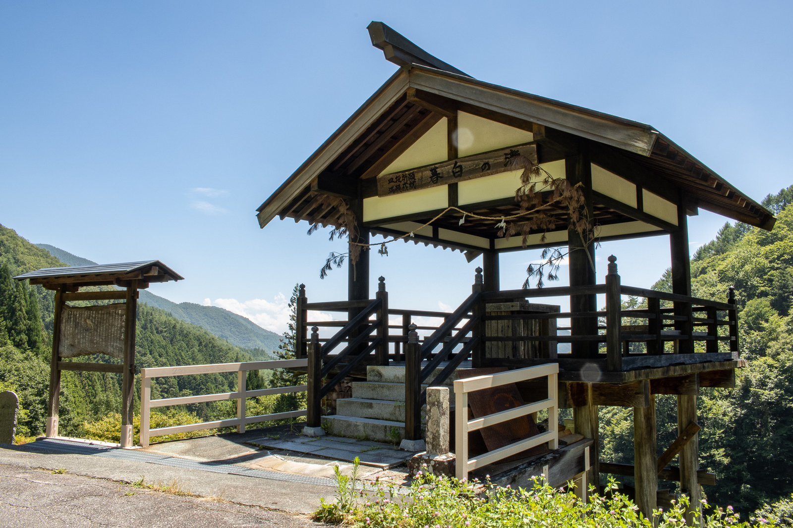 「夕暮れになると、滝がほの白く見える」というロマンの滝です。願いを書いたお皿を投げると望みが叶うといわれており、お皿の飛んだ方向によって行方を占います。天候がよいと南アルプスの山々も臨むことができます。