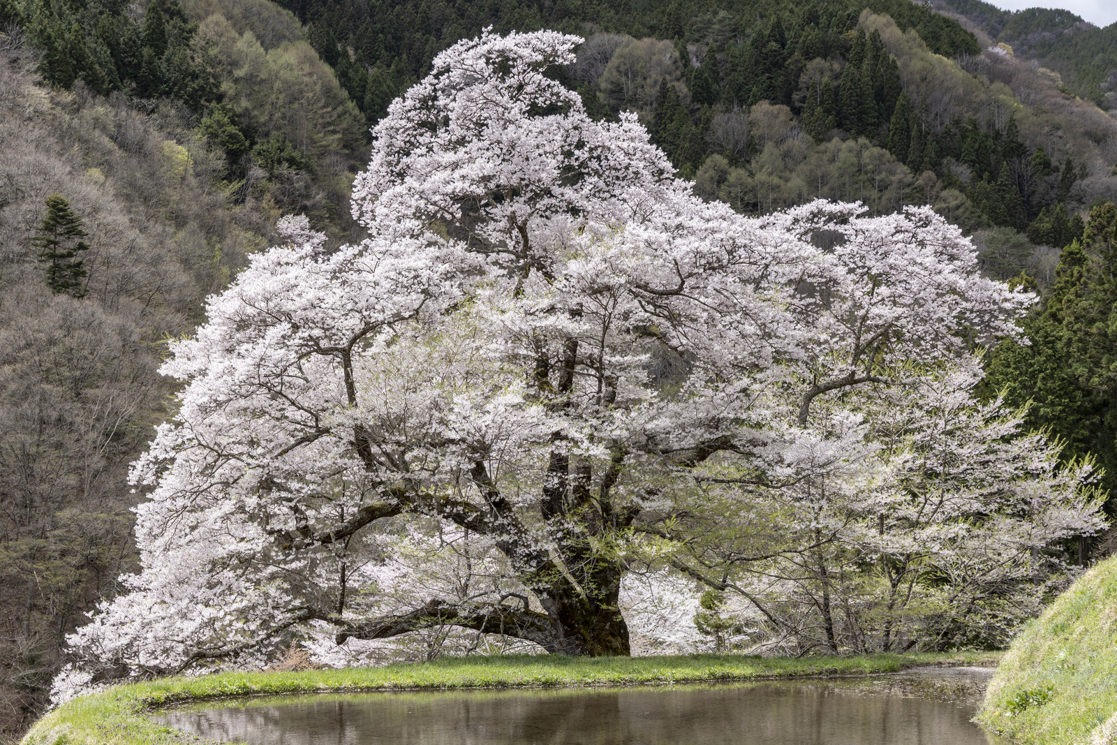 樹齢450年以上と推定されるエドヒガンの一本桜です。かつて、源義経が奥州へ下るときに馬をつないだといわれています。