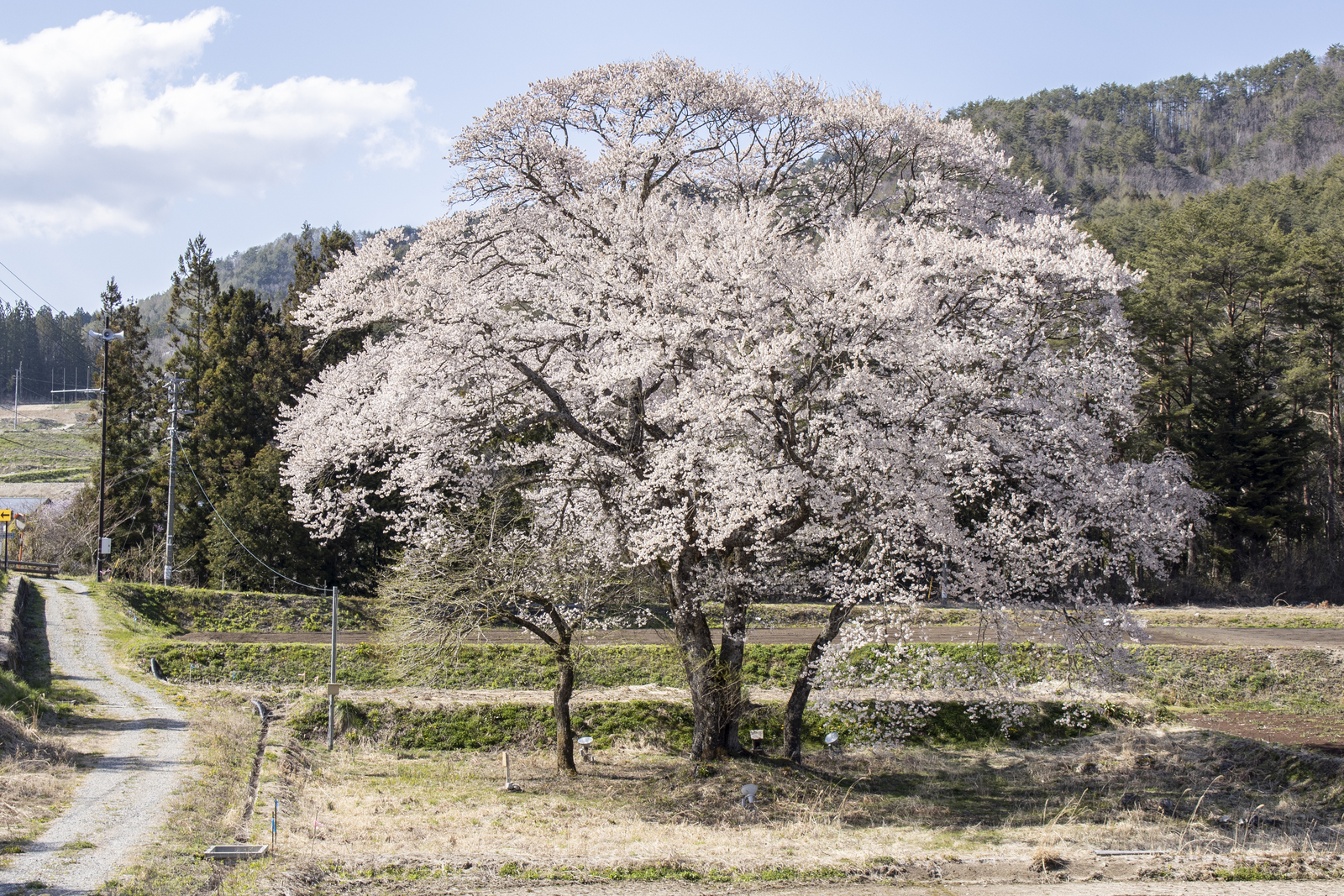 樹齢350年以上と推定されるエドヒガンの一本桜です。尹良親王の仮御所跡地にちなんで名づけられたと伝えられています。