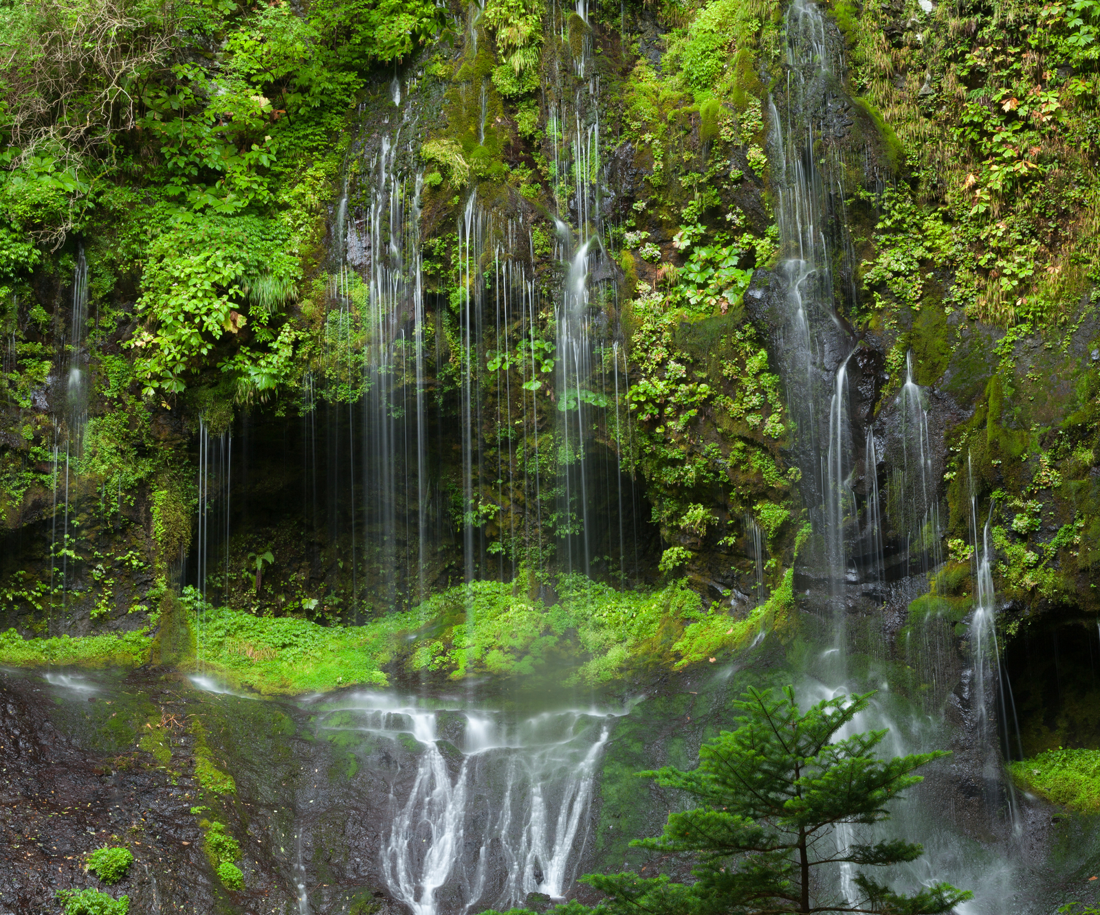 御嶽山四合目にある滝。太古の時代からその「容姿を変えぬ」との由来で、名付けられました。多くの樹木に囲まれ、地下水が岩からしみ出してくるような繊細な姿は、まるで水墨画を思わせるような美しさです。