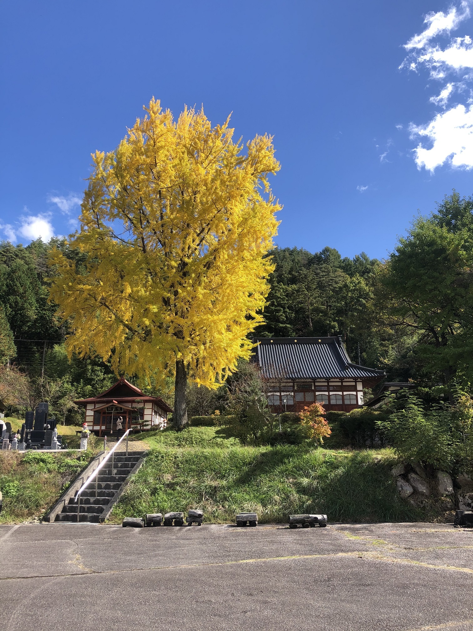 町の中腹にそびえ立つ長福寺の大銀杏。10月下旬から色づき始め見頃時期には黄金色に輝く。運が良ければ初冠雪の北アルプスも見ることができる。