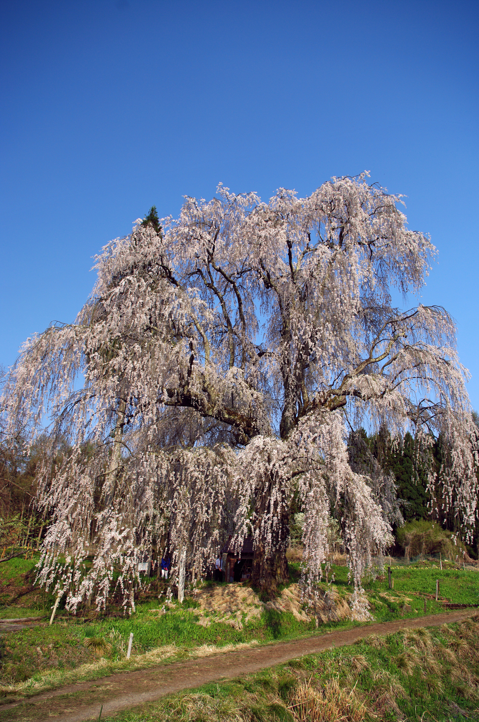 樹高約22メートル、樹齢は推定250年余りの勢いのある大樹で、高山村指定の天然記念物。背景には北信五岳が望める。<高山村五大桜>