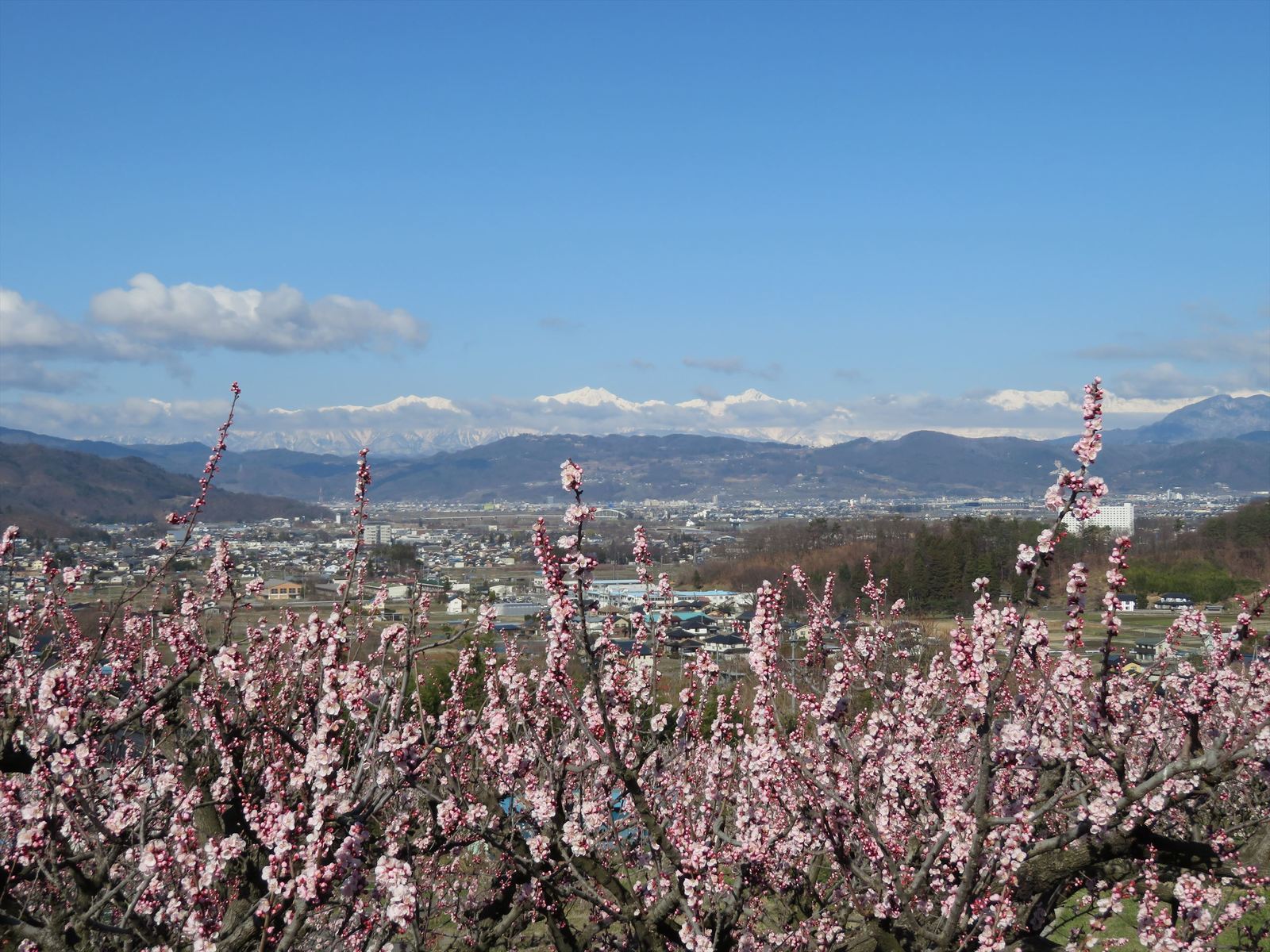 尼巌山、奇妙山の南山麓一面にピンク色の花が広がります。好天の日は、遠くに北アルプスもくっきり!!