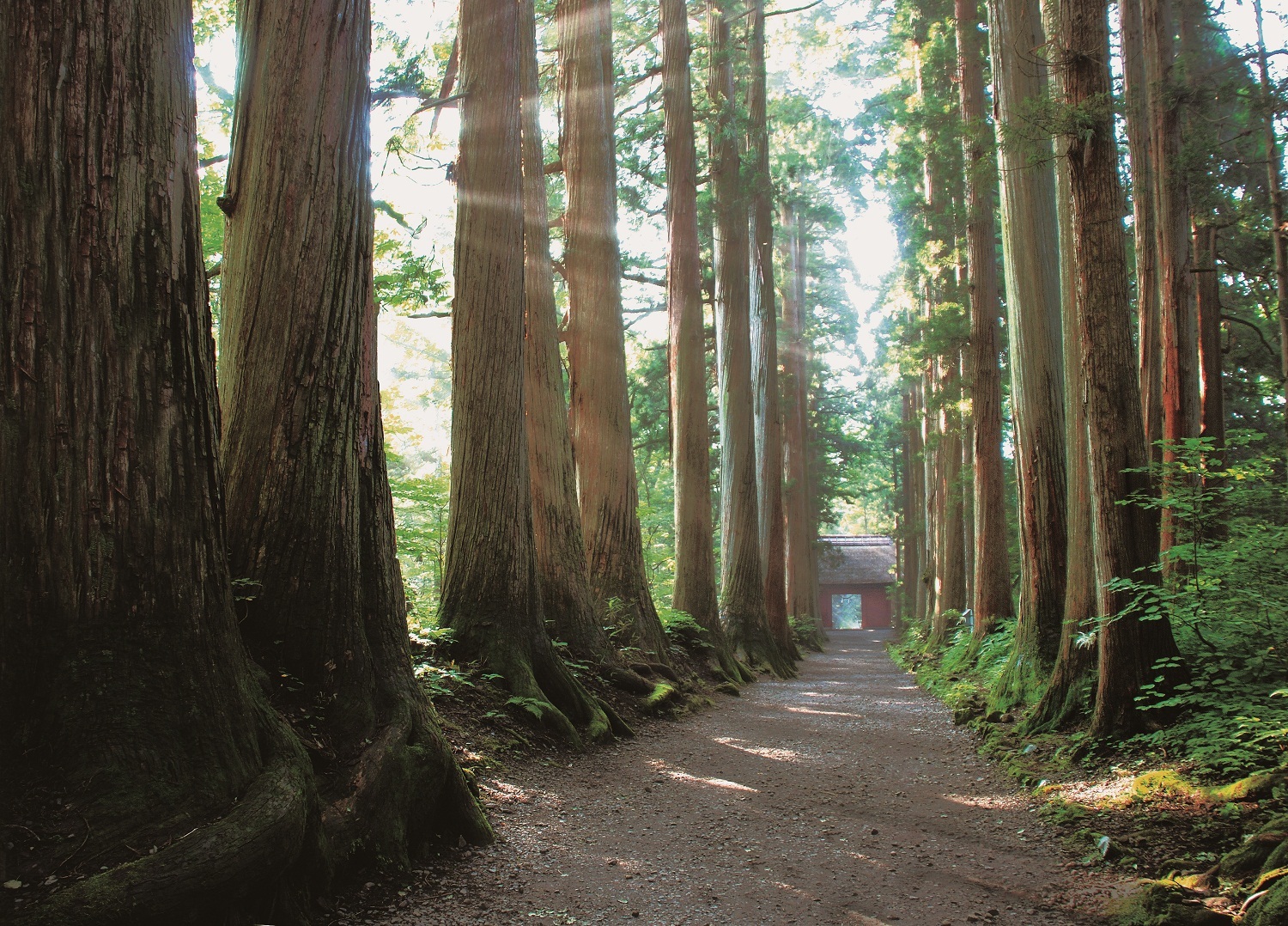 随神門をくぐり進むと、両側に樹齢約400年の杉並木があり、神秘的な雰囲気です。
