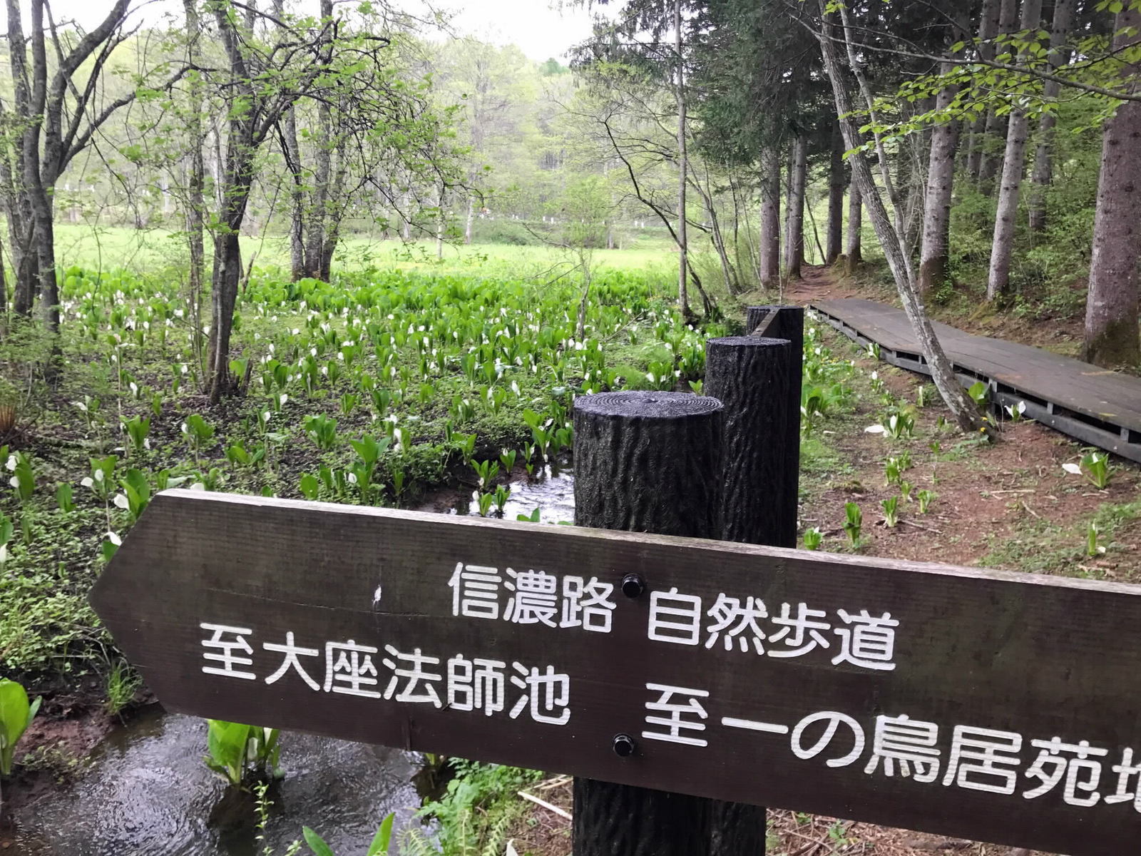 大座法師池からミズバショウ、リュウキンカの美しい大谷地湿原を通り、一の鳥居苑地までのルート。