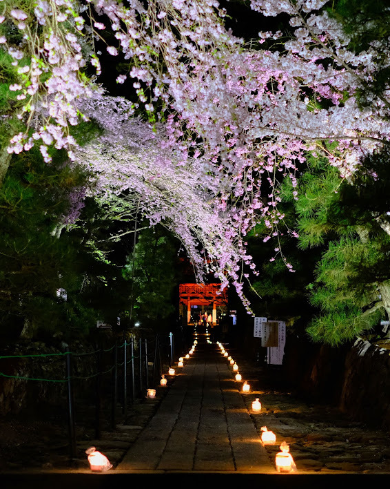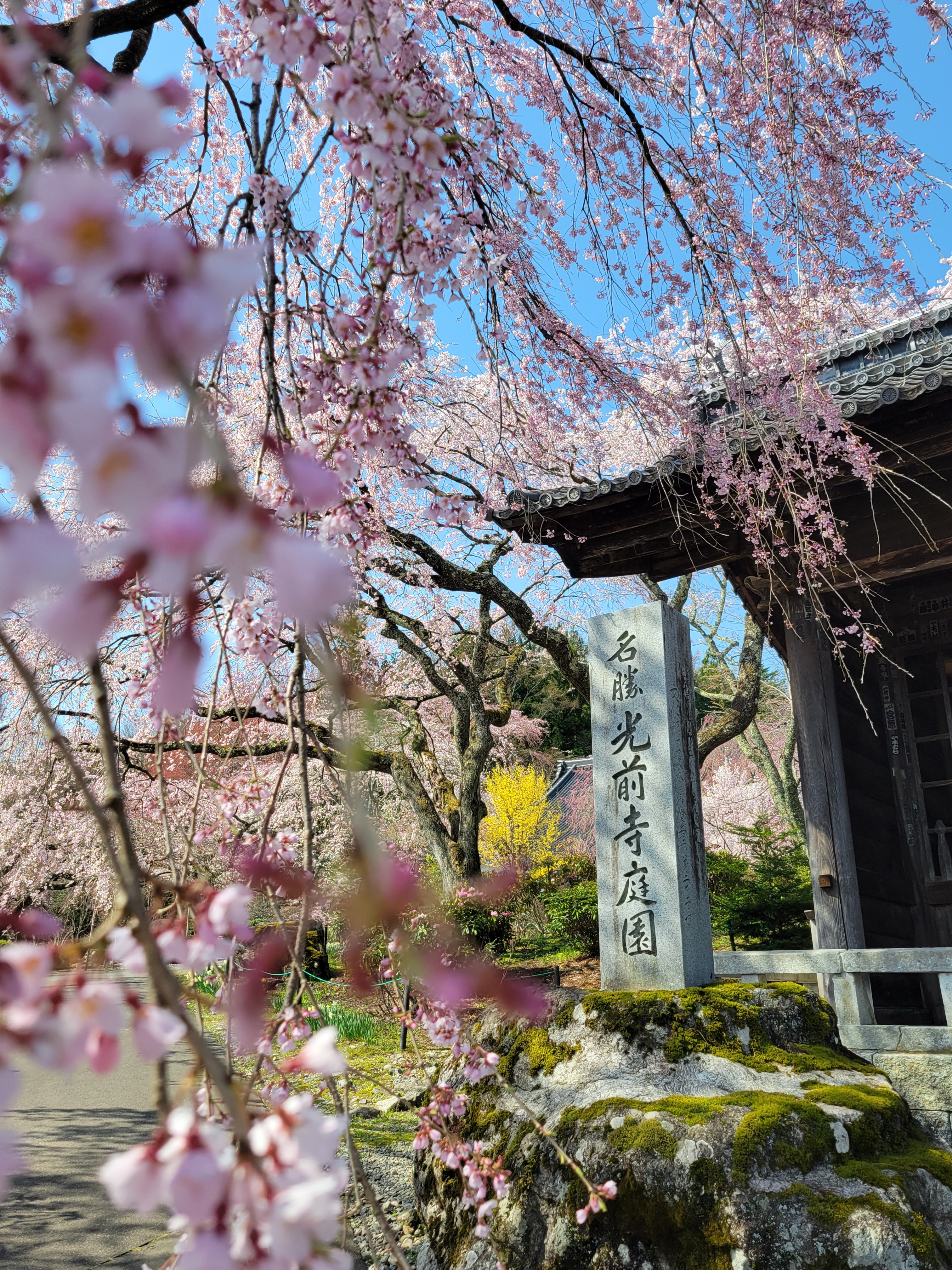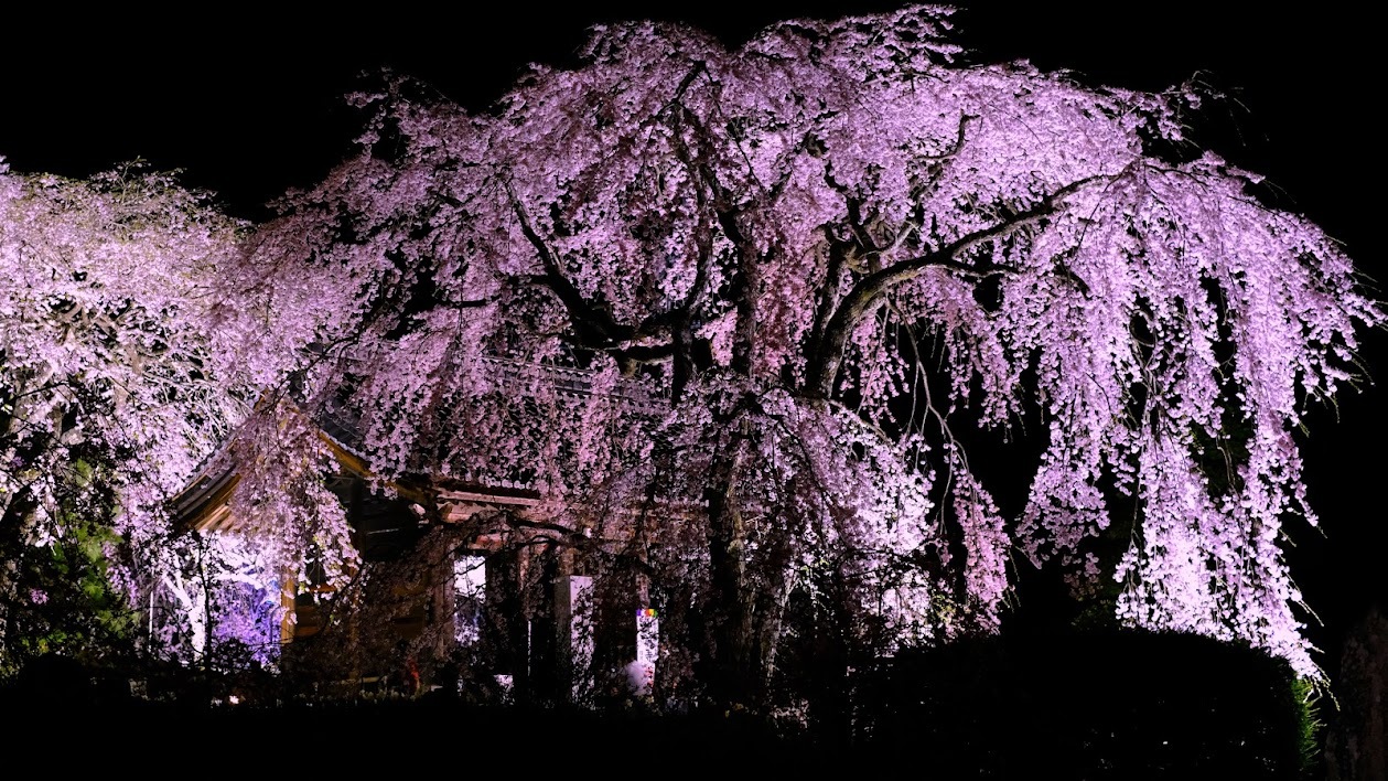 光前寺は南信州随一の祈願霊場として知られ、光苔や樹齢数百年の杉並木に囲まれた境内には、重要文化財の弁天堂や三重塔が立ち並びます。仁王門から大講堂付近を中心に約70本のしだれ桜が植えられており、桜の開花にあわせてライトアップされます。昼間の桜とはひと味違う夜桜の幻想的な美しさをご堪能ください。