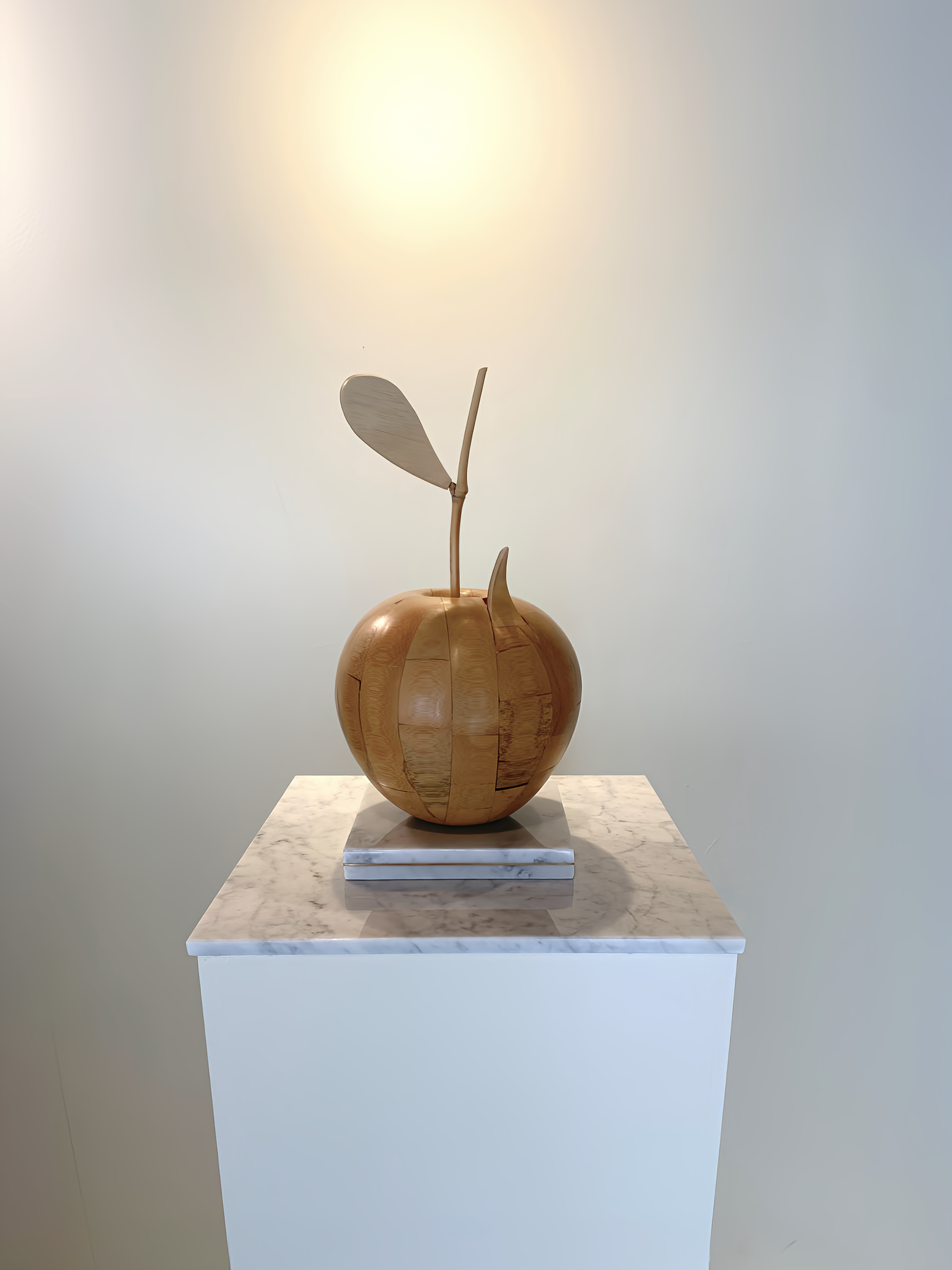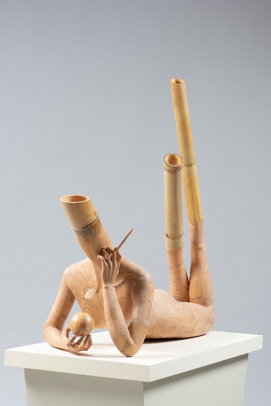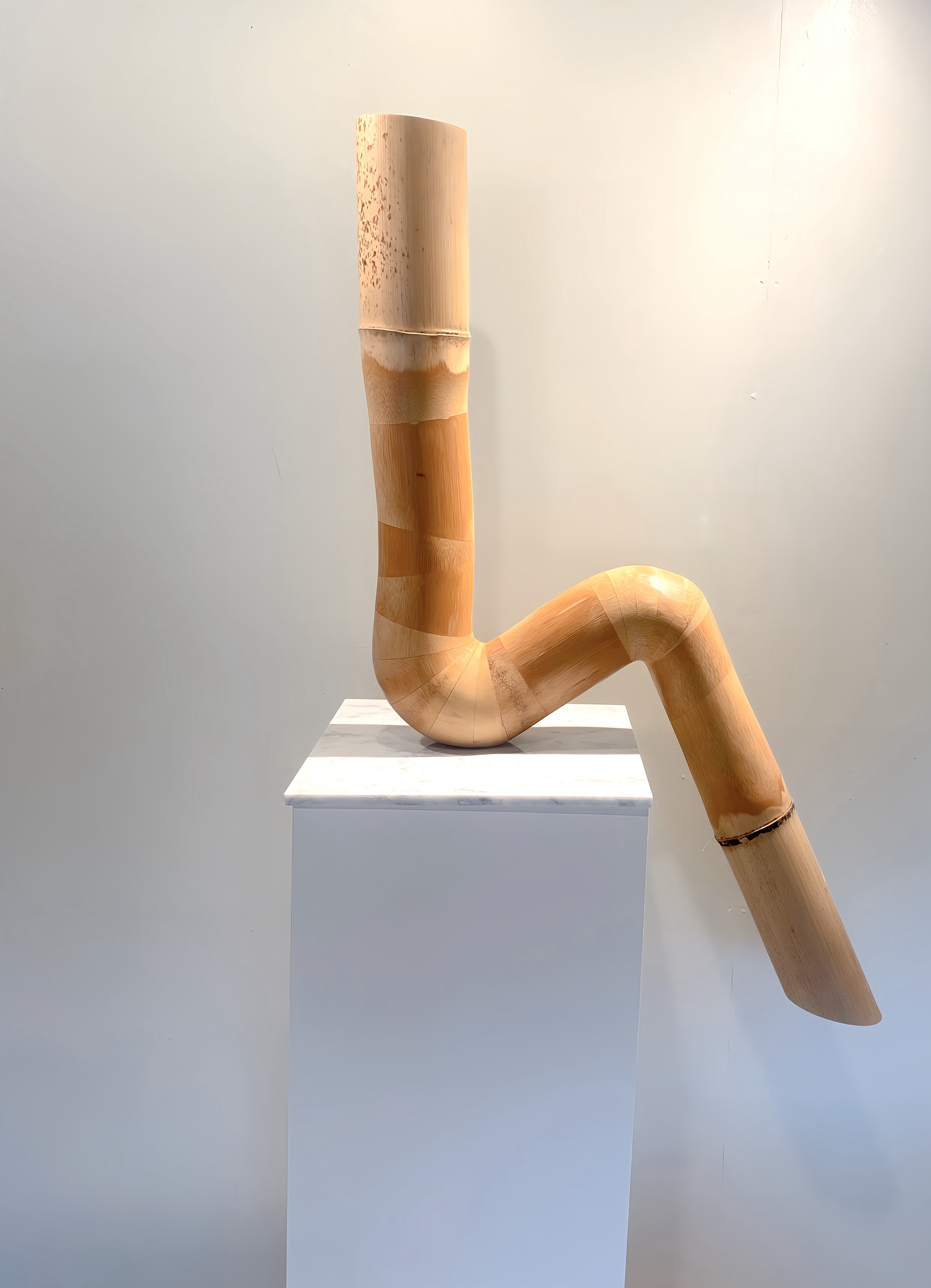 切った竹のパーツを貼り合わせては削りという工程を繰り返し、竹という概念を見事に壊した滑らかな曲線と質感の美しい作品に圧倒されます。