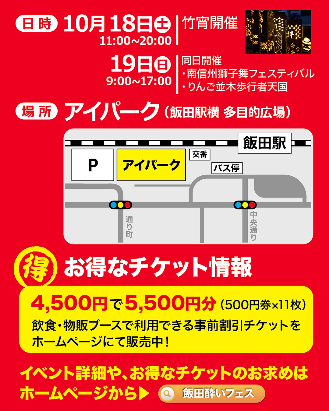 | 事前チケット | ①お得な割引チケット:4,500円で5,500円分(500円×11枚)に交換。 飲食・物販ブースで利用可。 ②飯田酔いフェス応援チケット:(寄付型)500円~ ③応援+りんごジュースチケット: 応援チケット(寄付型)+りんごジュース1L 1000円~ 南信州産りんごジュース1Lプレゼント |