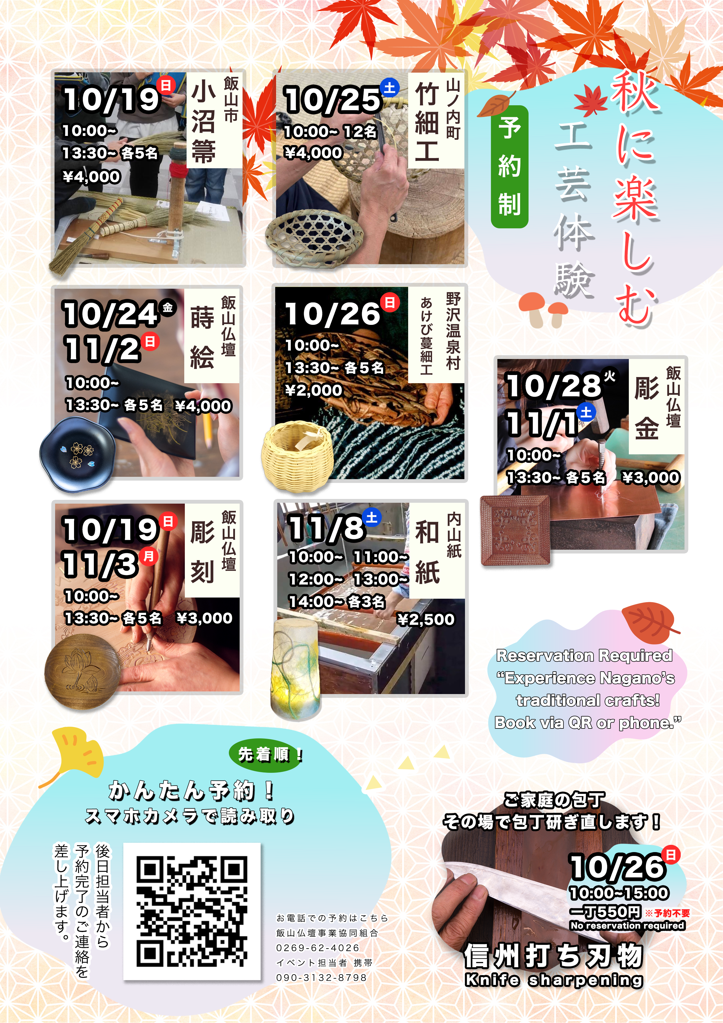 親子でも参加できる【秋の工芸体験】も開催。竹細工や紙すき、彫刻、蒔絵、あけび蔓細工など、地元の職人が直接指導する本格ワークショップが揃っています(要予約・各回定員制)。自分の手でつくる体験は、旅の思い出やお土産にもぴったり。