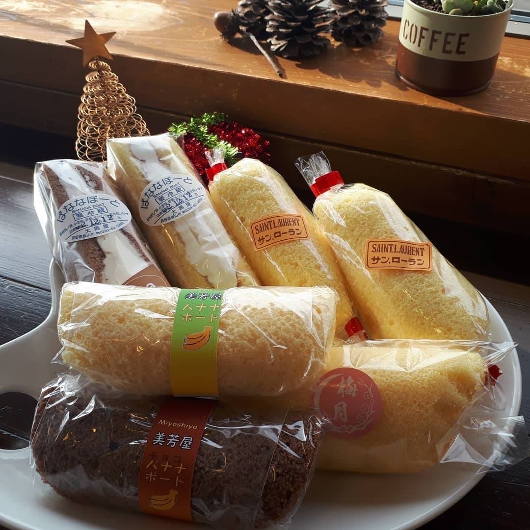 「バナナボート」とは、柔らかいスポンジケーキにバナナをはさんだスイーツのことで、飯山市の冬の名物として親しまれています。まだ十分な冷蔵設備がなかった昭和50年頃より作り始めたと言われており、現在は市内の和洋菓子店で販売されています。