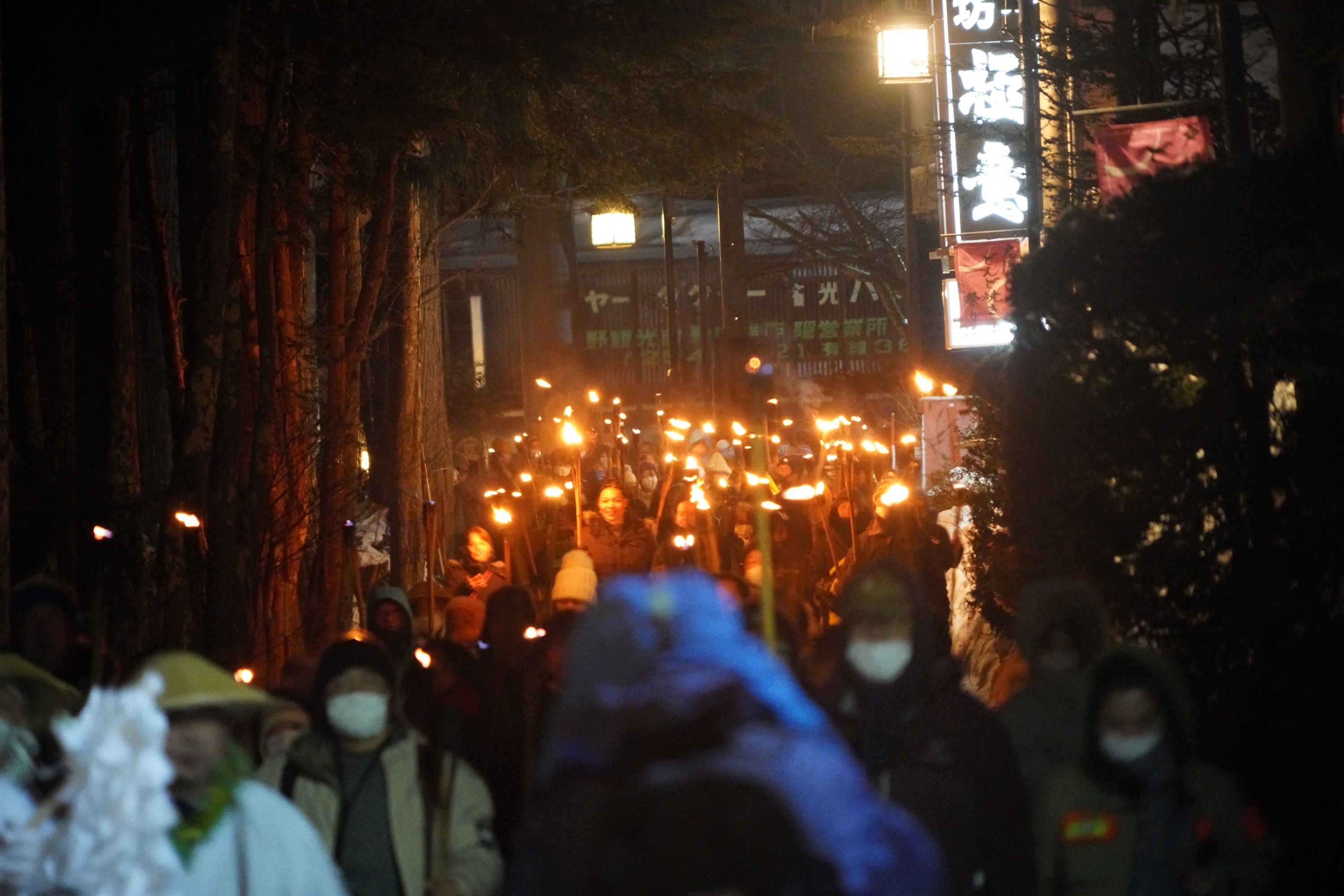20:00 中社ゲレンデ 松明行列到着 やぐら点灯
