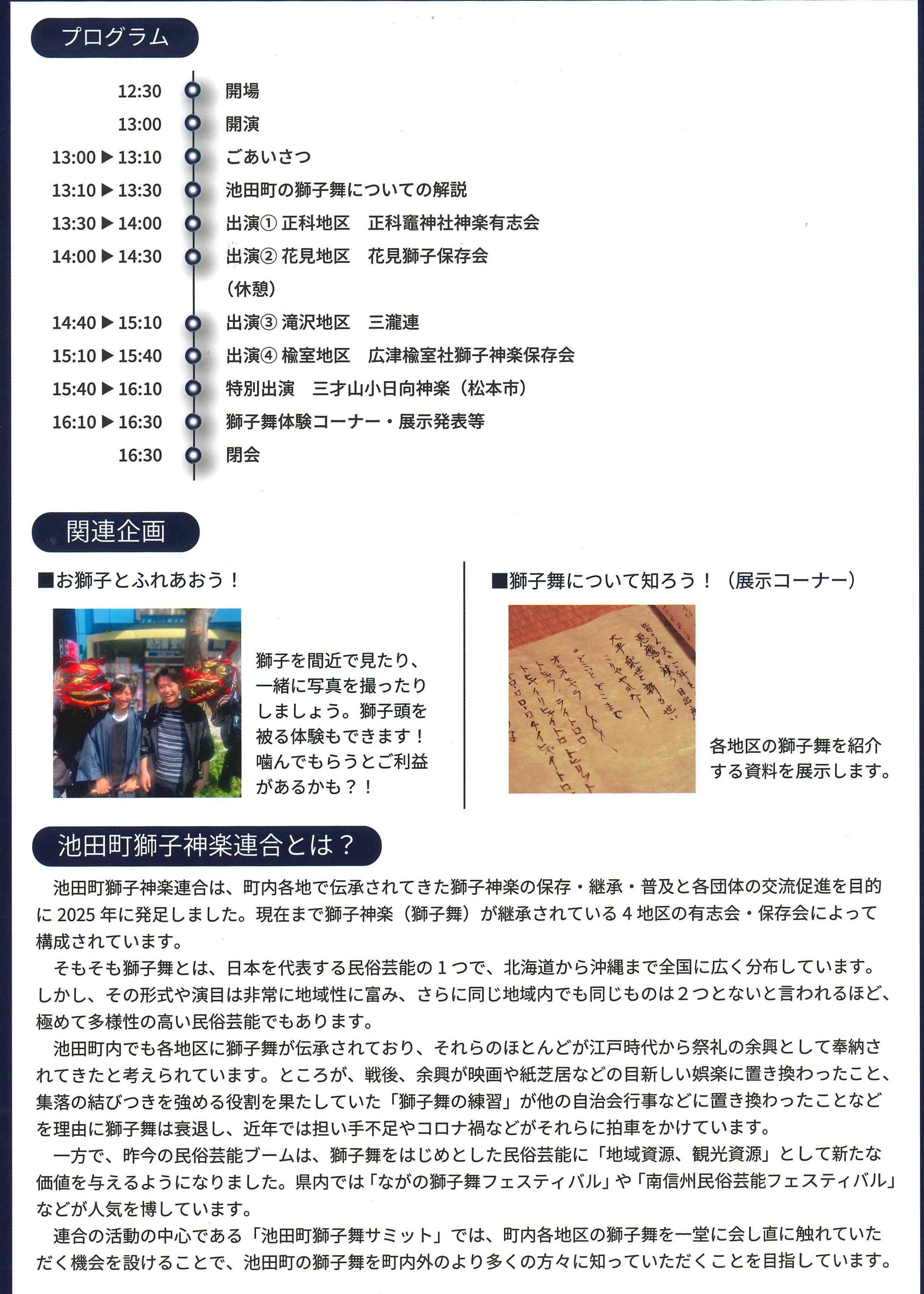 池田町の各地区で大切に受け継がれてきた獅子舞が集まり、舞と囃子を披露する「獅子舞サミット」。