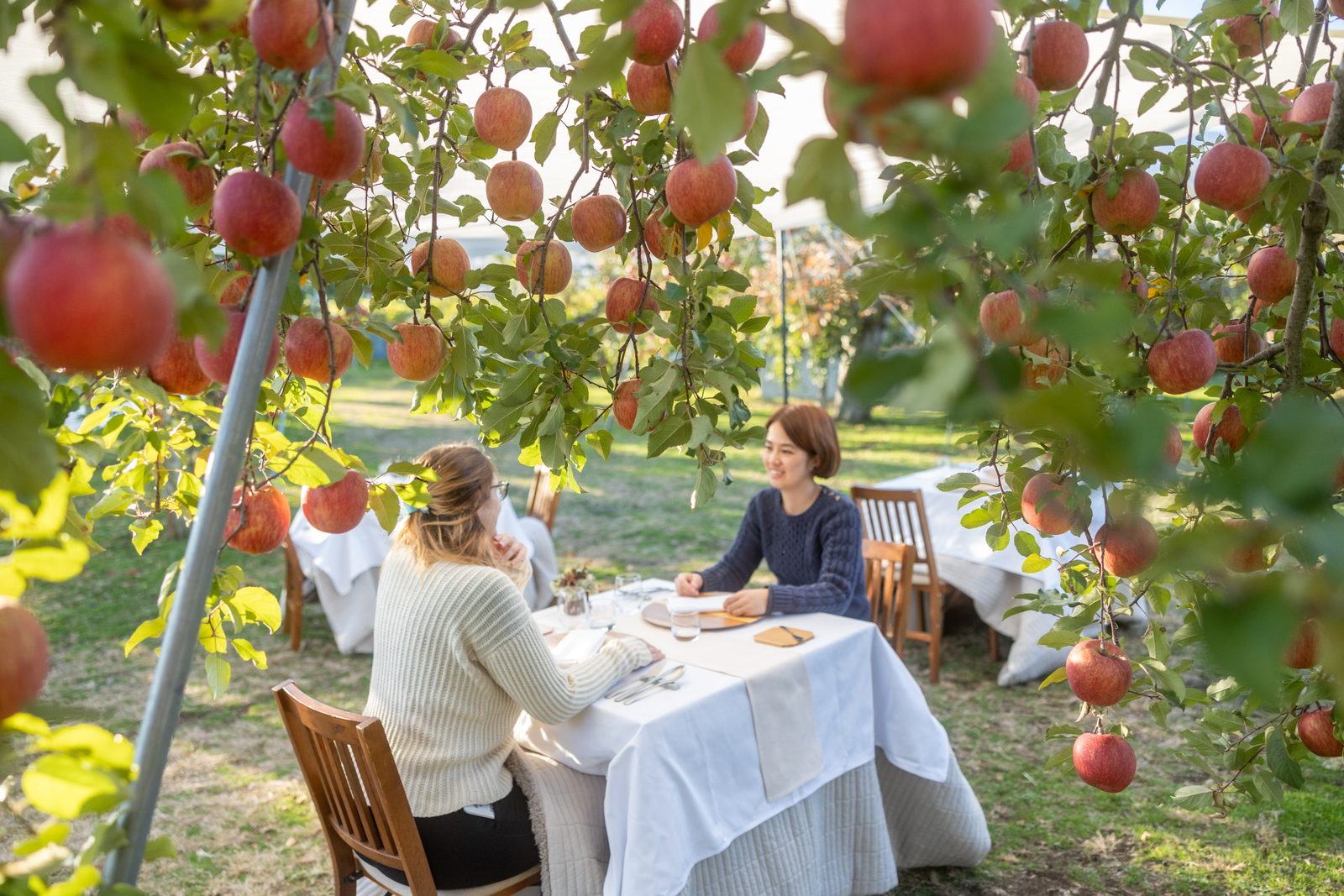 在果園樹蔭搖曳的陽光下,展開一場結合自然與美食的旅程。導覽步行穿梭果園、遠眺南與中央阿爾卑斯山,並以在地蘋果酒乾杯揭開序幕。七道精緻的地產法式料理,邀您細細品味信州大地的恩賜。